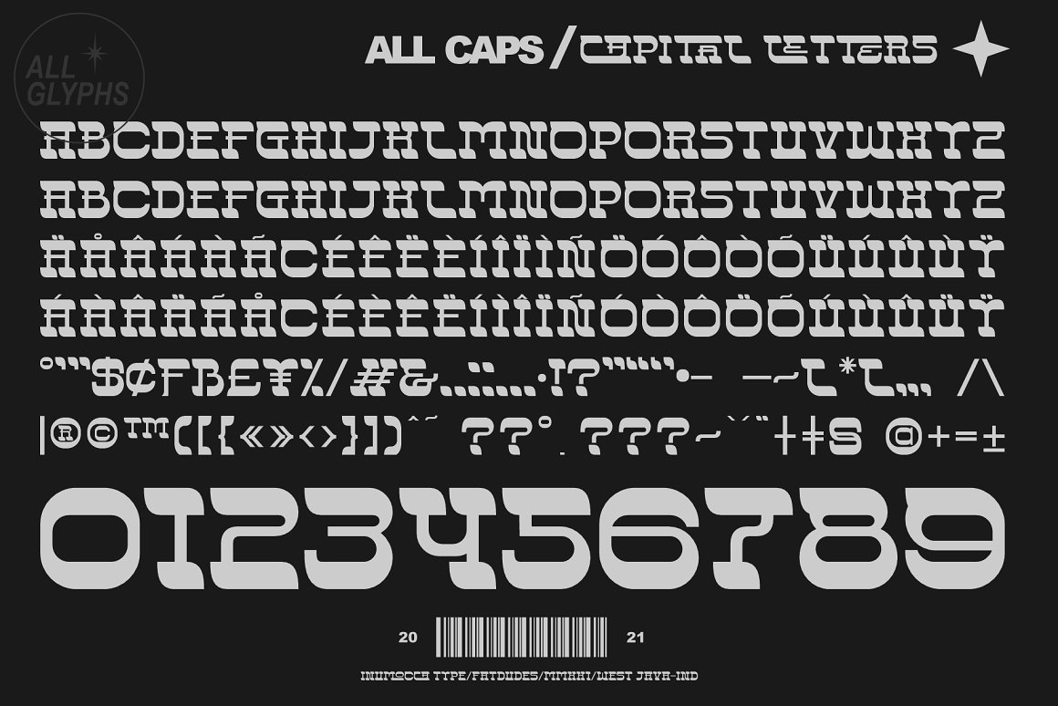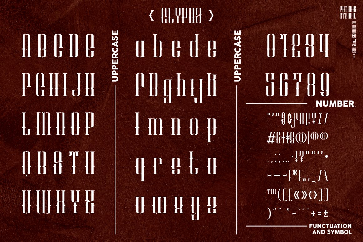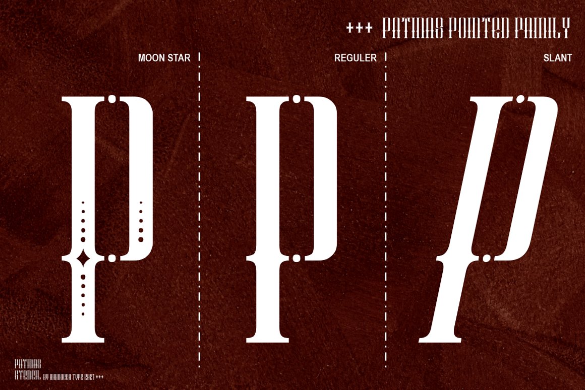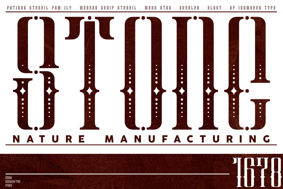 Patinas Stencil Family come with 3 Style Moon Star , Reguler and Slant. Modern Urban Serif Font, Powerfull and has a great Character, Good Font to use for covering your Project, like Branding, Headline Letter, Flyer, Signage, Quotes, Poster Typography, Bookcover, Magazine cover, Poster, Quotes Lettering, Logos, and more your project design.