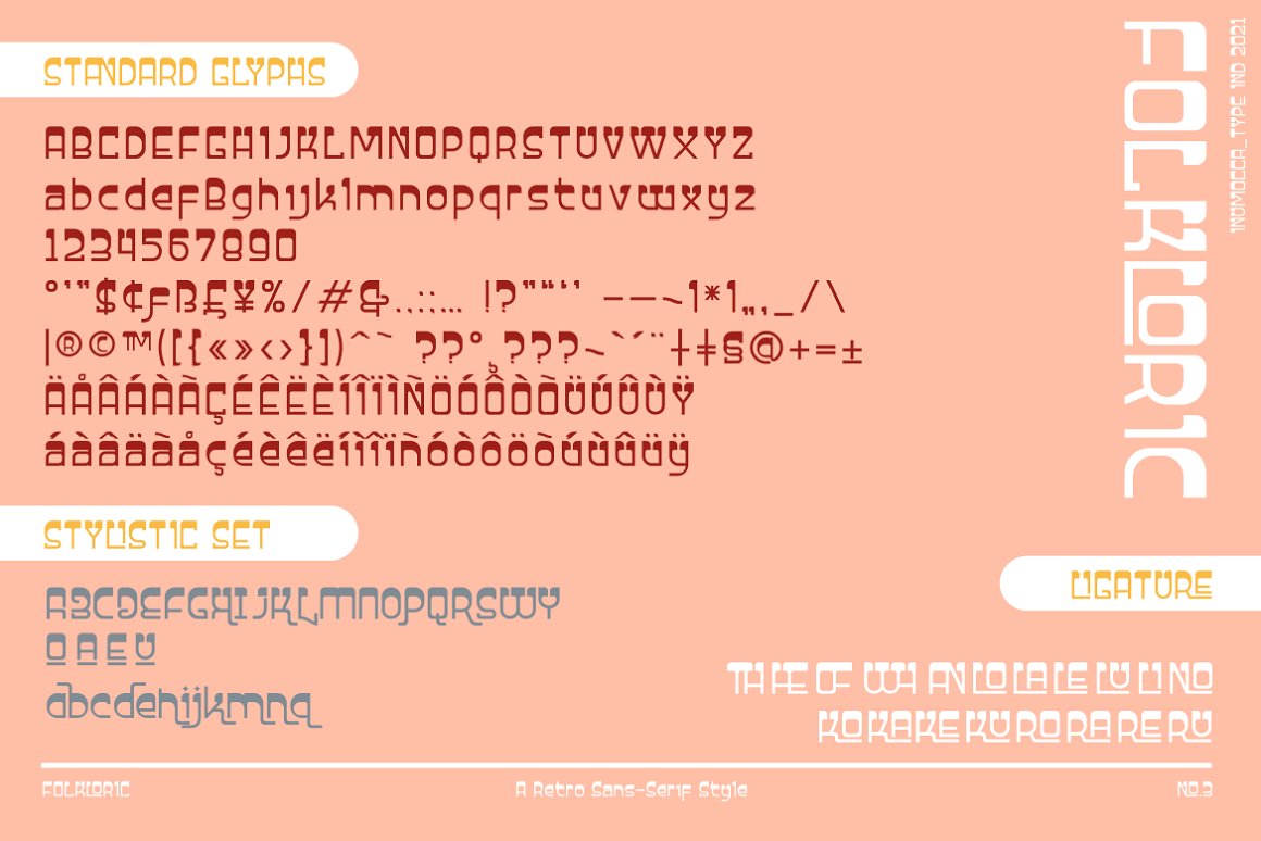 FOLKLORIC is A Retro Sans-Serif Style They were particularly common in the 70s, this is a great choice for expressing a summer. The Typeface comes with Stylistic Set and Ligature Combinations Exellent typeface to use for covering your Project, like Branding, Movie Title, Headline Letter, Bookcover or Book Content, Magazine cover, Poster, Quotes Lettering, Logos, and more your project design.