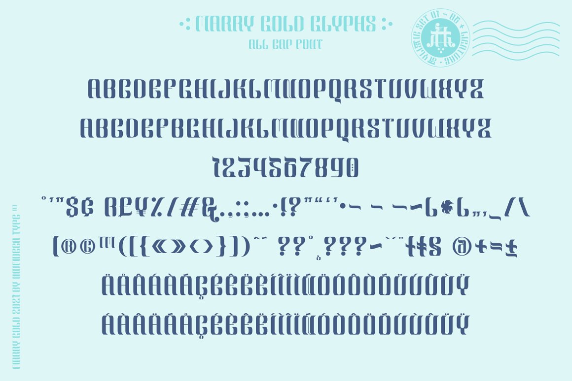 MARRY GOLD is A Retro Display Typeface, Come from 70s Style. The Typeface comes with Stylistic Set and Ligature Combinations Exellent typeface to use for covering your Project, like Branding, Movie Title, Headline Letter, Bookcover or Book Content, Magazine cover, Poster, Quotes Lettering, Logos, and more your project design.