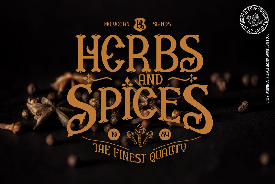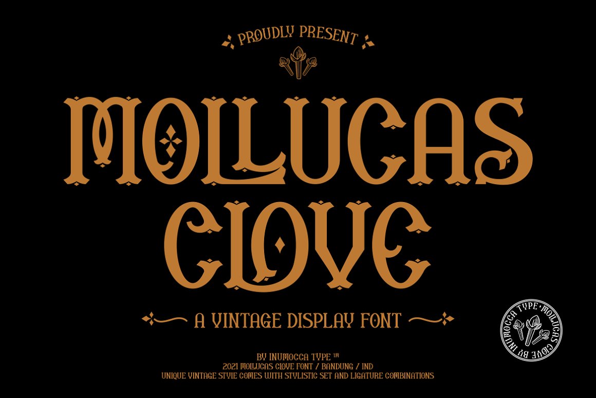 Mollucas Clove is A Vintage Display Font, Unique Vintage StyleWith Some Stylistic Set and Ligature Combinations Exellent typeface to use for covering your Project, like Branding, Movie Title, Headline Letter, Bookcover or Book Content, Magazine cover, Poster, Quotes Lettering, Logos, and more your project design.