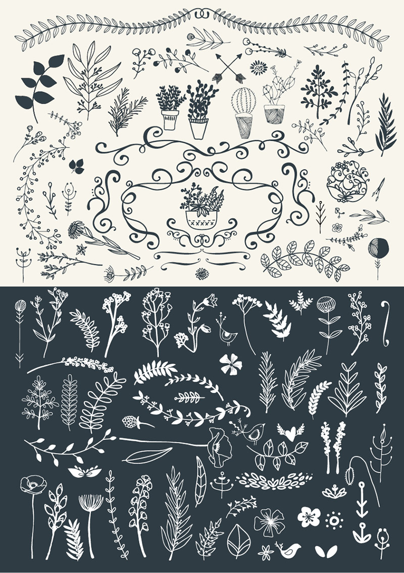 Easy-to-use hand drawn floral vector kit! I aimed to produce an ultimate set that will give you everything you need to create lovely designs using flowers, leaves, wreaths, borders and more! All 150 elements come in both white and black versions giving you a total of 300 items – just click on the preview slides to see the full pack. 110 floral original hand-drawn elements, 20 unique wreaths and 20 unique borders – drag into your brushes panel to create custom brushes. It’s super-easy to change the colors in Illustrator and match the color palette of your designs. The wreaths work well alone, or stack them to create a beautiful layered effect. Wedding stationery design will be a breeze with this set! And creating logos with leaves and flowers will be a effortless 🙂 ADOBE ILLUSTRATOR CS OR NEWER REQUIRED!
