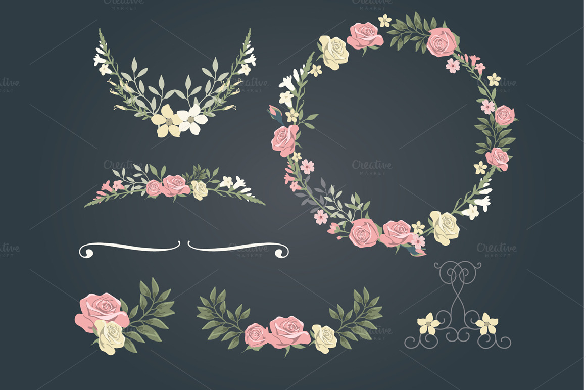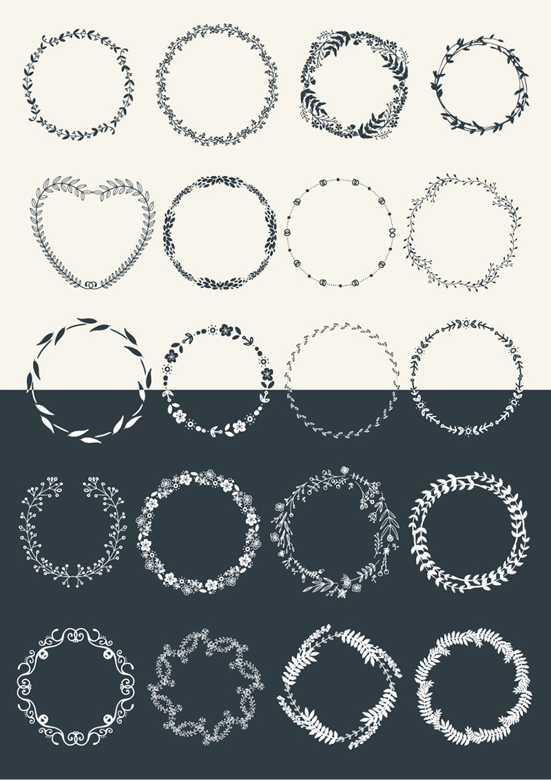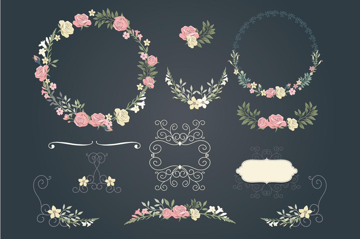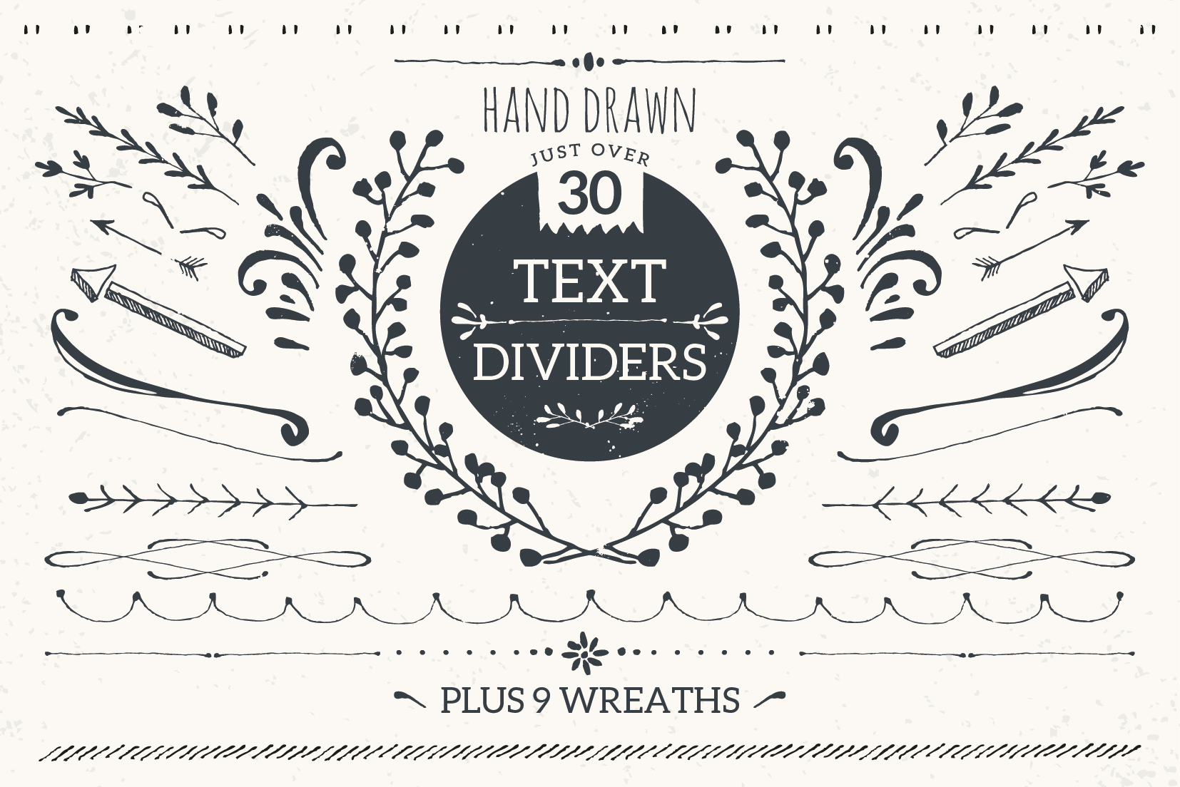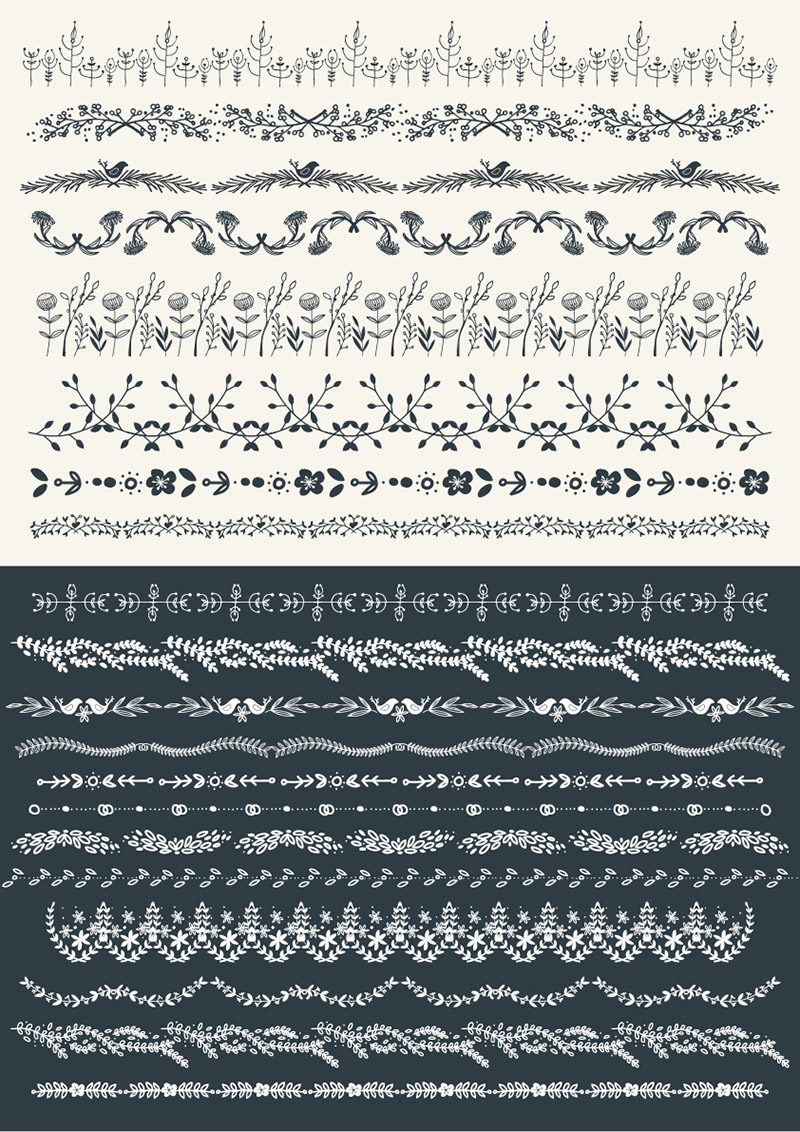 Versatile, useful, fun! A collection of drawings converted to vector for your designing pleasure. Includes swirls, dividers, branches, wreaths and more. You’ll receive 30 dividers and 9 wreaths in both black and white. ADOBE ILLUSTRATOR CS OR NEWER REQUIRED!