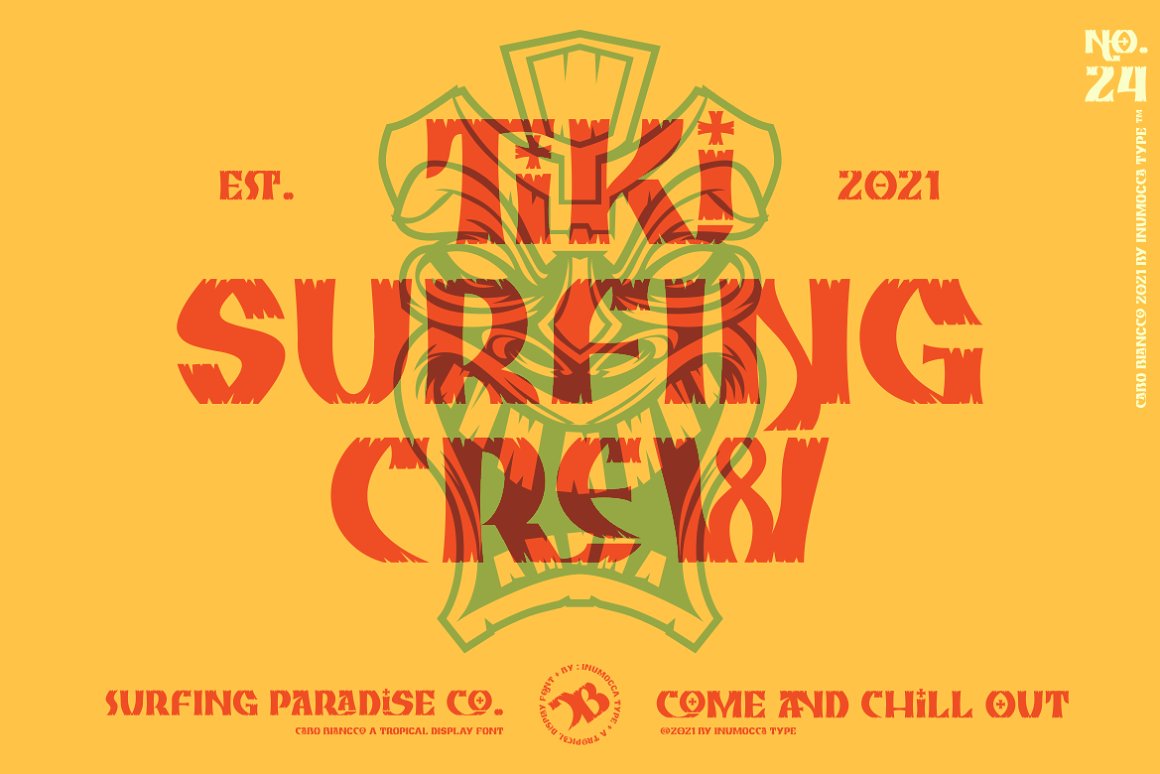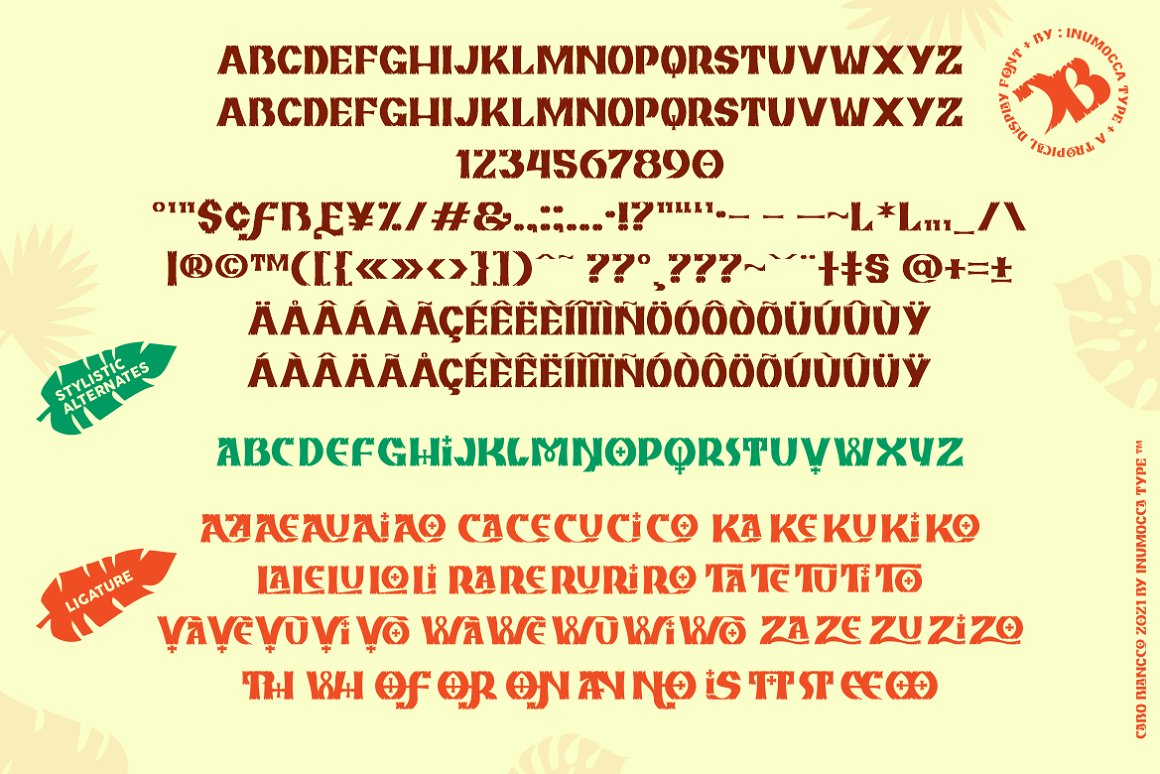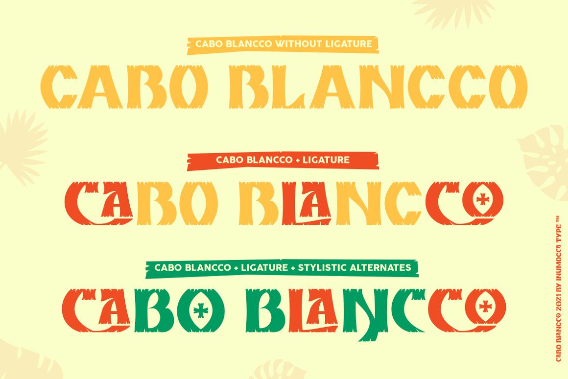 CABO BLANCCO is A Tropical Display Font inspired by a traditional carved wooden tiki, Powerfull and has a very distinct and Bold Character, Great for expressing a summer,The Typeface comes with Stylistic Alternates and Ligature Combinations Exellent typeface to use for covering your Project, like Branding, Headline Letter, Flyer, Signage, Quotes, Poster Typography, Bookcover, Magazine cover, Poster, Quotes Lettering, Logos, and more your project design.
