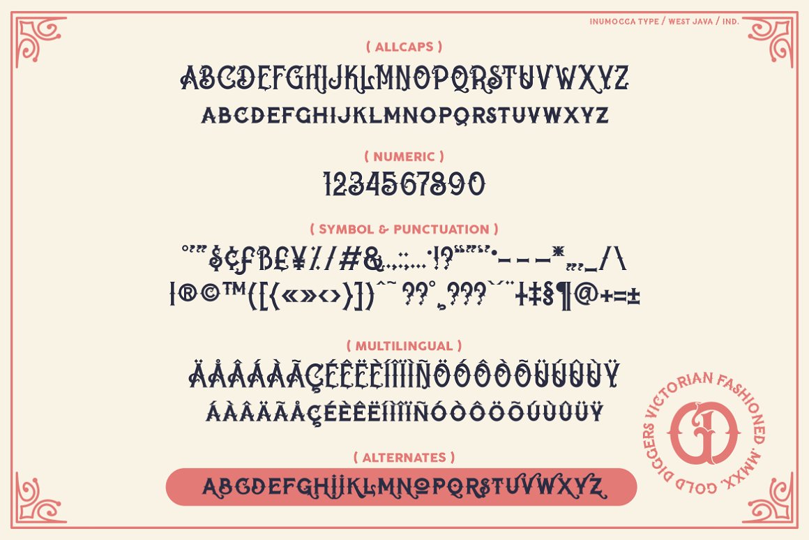 Gold Diggers, inspired from Victorian Era with the ornamental and decorative font With Variant for the Capital Letters and alternates for changes the unique glyphs for design needs like Poster, logos, badges product, magazine with vintage taste and more your project design.