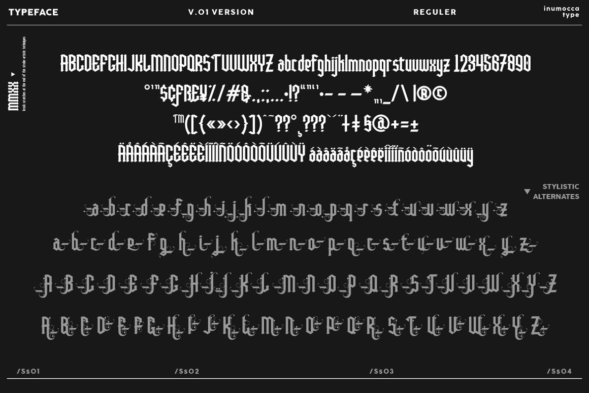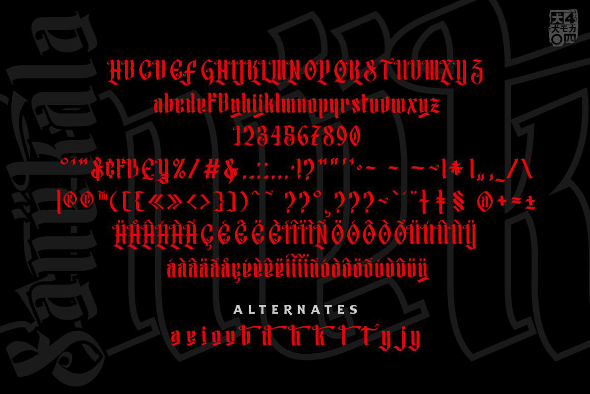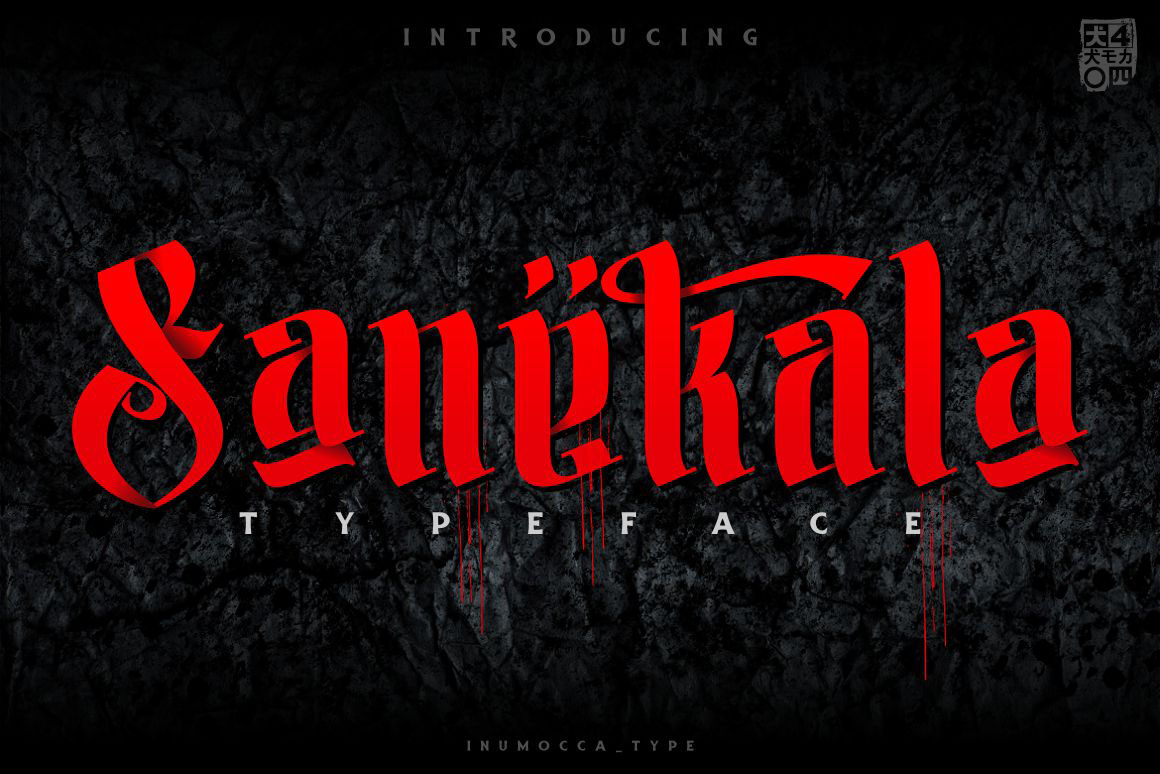 Sanekala Typeface its blackletter style with some touch some story behind the Name and character Sanekala sundanese language, Sanekala From “Sane” (Sanes {indonesia bahasa} is “not”), and “Kala” (Waktu {indonesia bahasa} is “Time”). Sanekala/ Not the Time, but it is very closely connected to the world of demons, like devils are predators of children. powerfull but also very calm the glyphs. really very flexible for others atmosphere, for personal project, or propesional project i think great for poster work, movie poster, book, tshirt, logos, band name, brands and others.