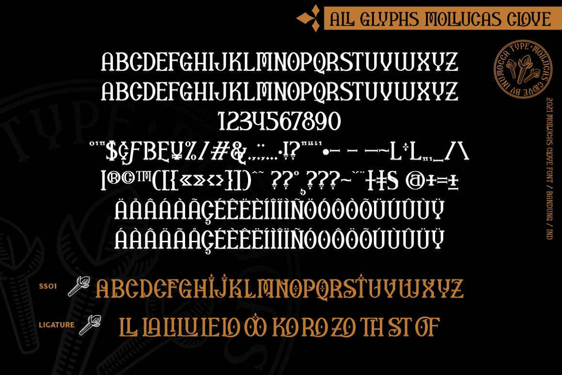Mollucas Clove is A Vintage Display Font, Unique Vintage StyleWith Some Stylistic Set and Ligature Combinations Exellent typeface to use for covering your Project, like Branding, Movie Title, Headline Letter, Bookcover or Book Content, Magazine cover, Poster, Quotes Lettering, Logos, and more your project design.