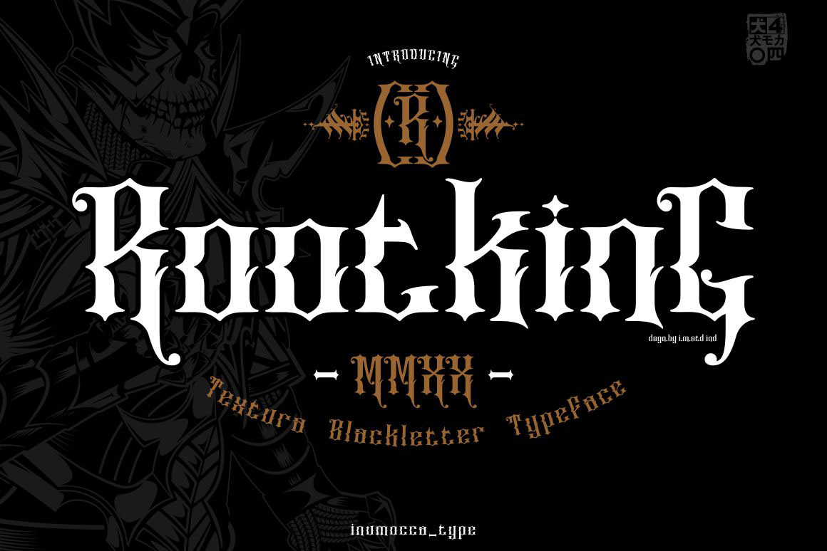 ROOTKING come from Gothic, Old English typography thin and thick strokes. the Textura Blackletter kinds, really strong, powerfull. so they are look best used for headings, logos, poster and sign. Blackletters have more recently become associated with beer label, Music, Book and many more