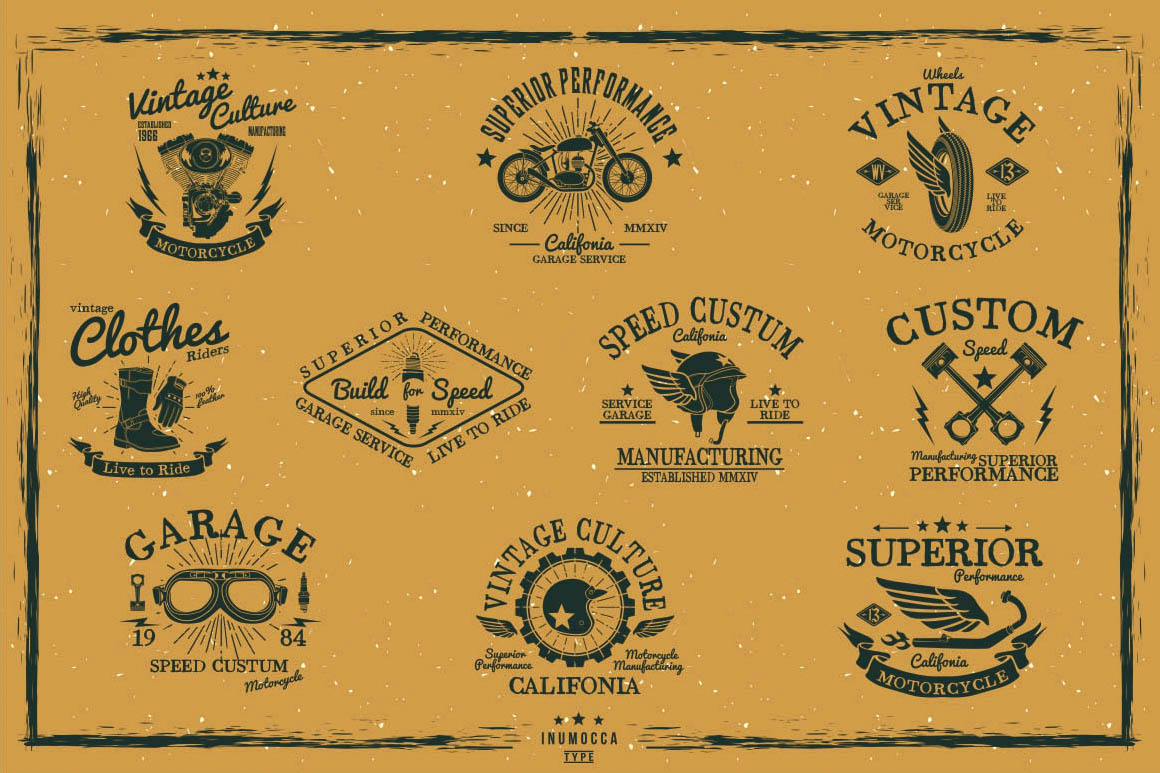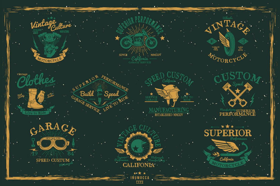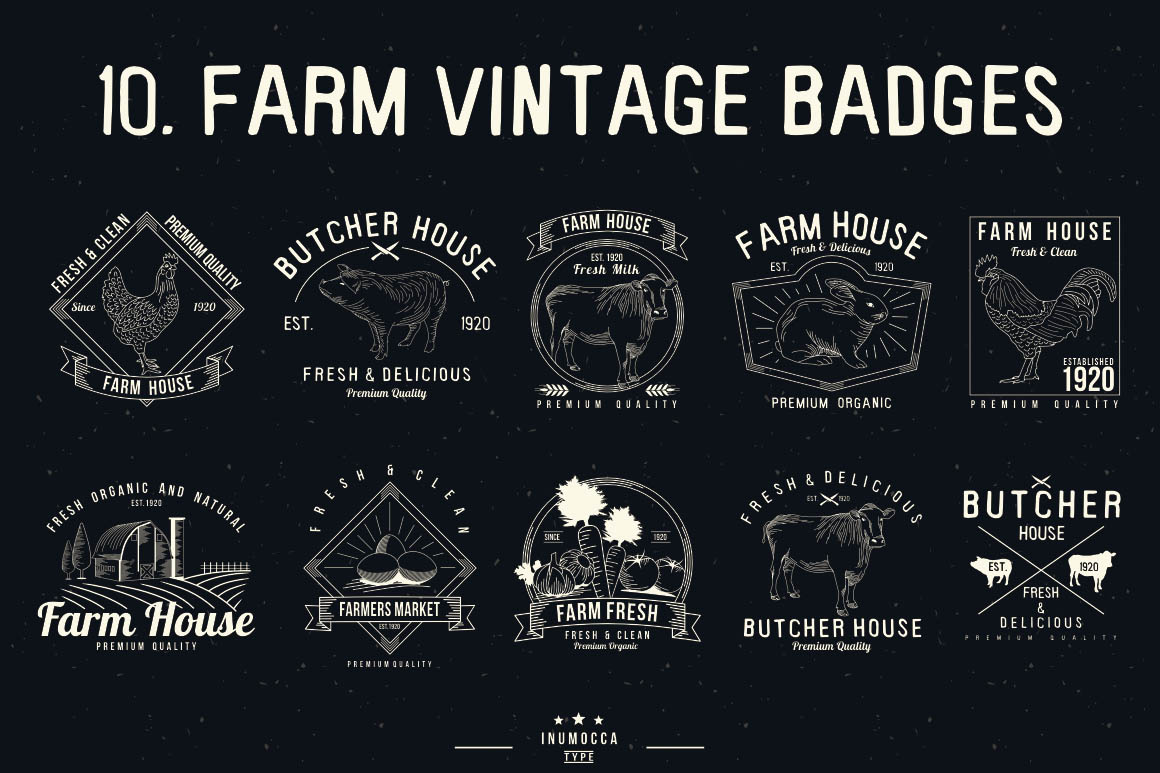 Unique collection of vinatge vector badges, handcrafted shapes and amazing custom fonts from Inumoccatype. Enjoy and good luck with your new vintage style artowrks 😉
