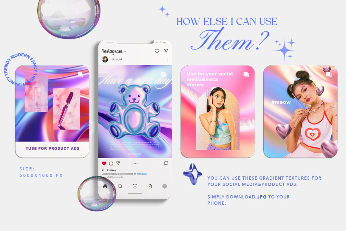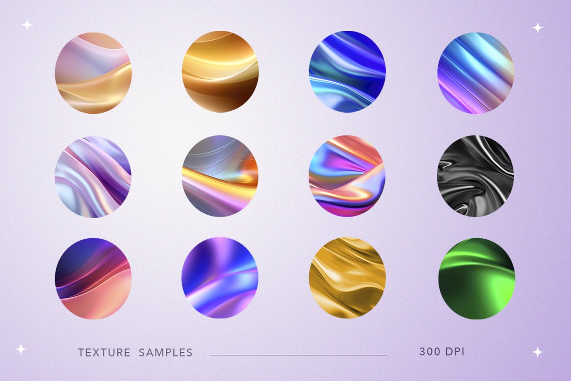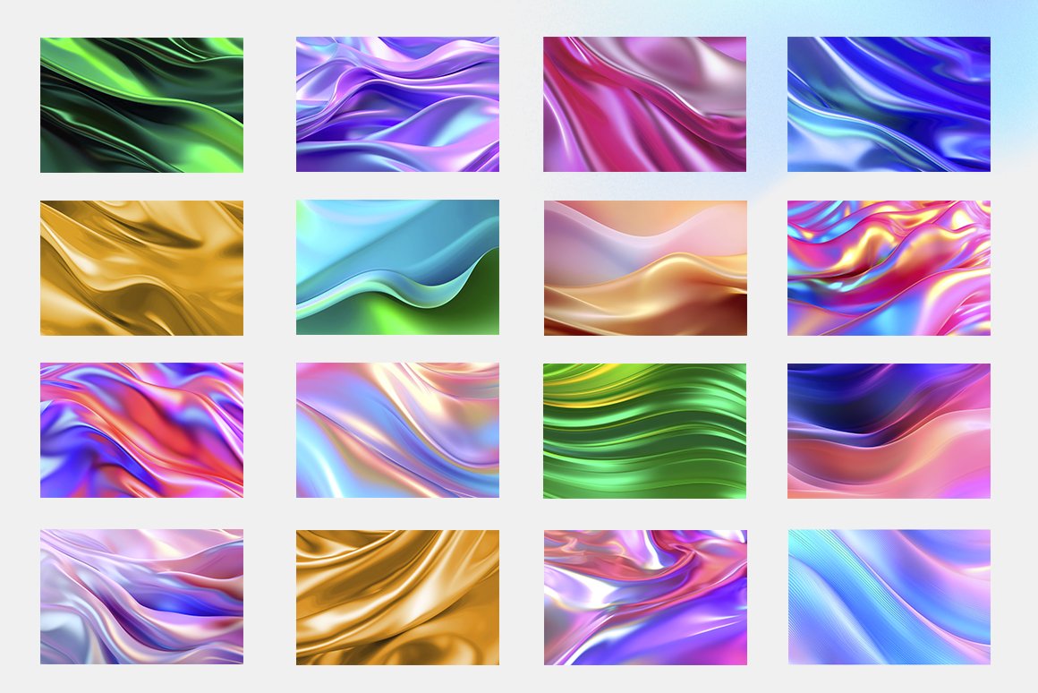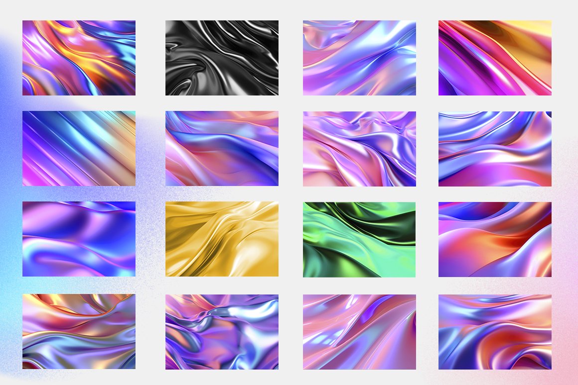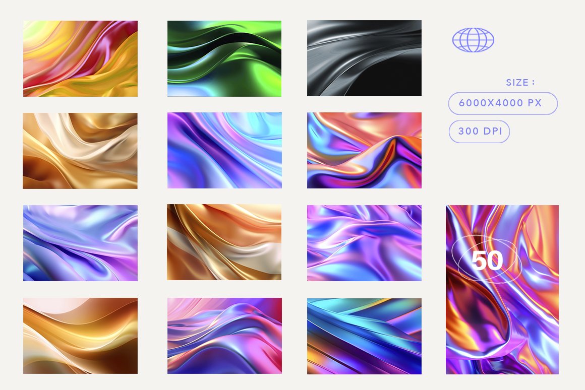 ✦ 50 Iridescent Wavy Gradient Textures – 50 gradient trendy backgrounds for your social media, product design and advertisement design. These backgrounds feature a unique blend of iridescent colors and fluid forms, creating a mesmerizing effect that is both eye-catching and versatile. 50 Colorful vivid textures in 6000 x 4000 size. Each background captures the intriguing allure of metallic iridescent texture, showcasing a range of vibrant and dynamic colors merged together in stunning harmony. Perfect for web, these gradient backgrounds are perfect for a wide range of applications, including website backgrounds, social media posts, packaging, invitations, and much more. With 50 different designs to choose from, you can easily mix and match to create a custom look that suits your project’s needs.