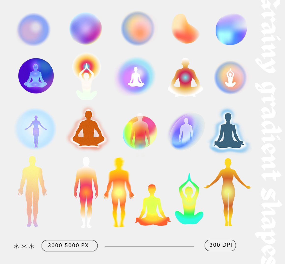 Aura Gradient Grainy Textures – a collection of 25 trendy grainy gradient textures, 16 arts of the human aura, and 25 gradient shapes. You can use gradients to add depth to an otherwise flat design, create an interesting texture for a background, or breathe new life and color into a photo.