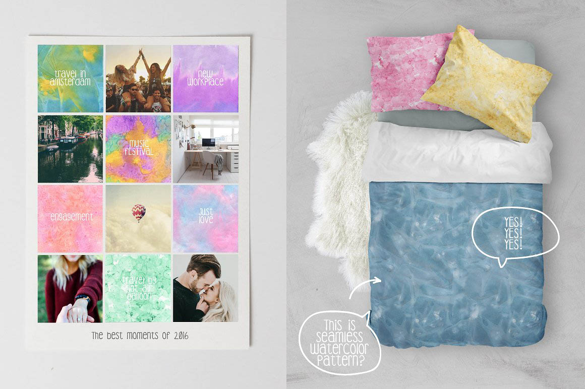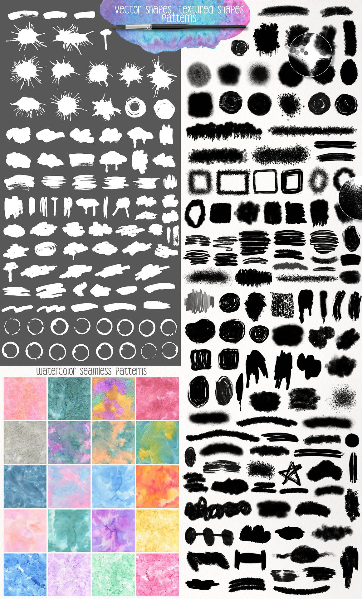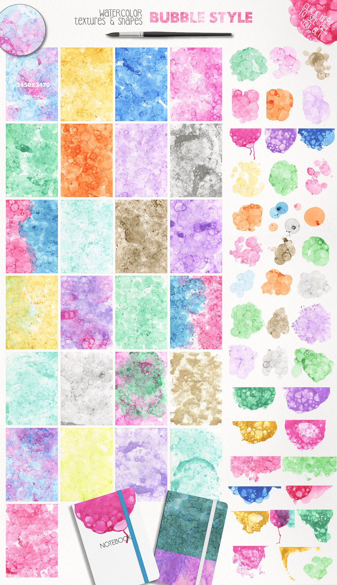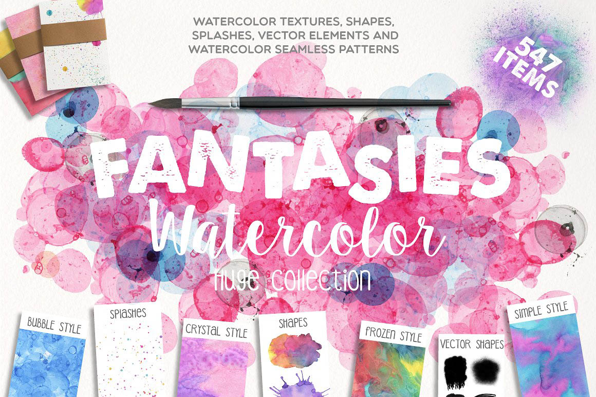 Amazing colorful and fancy illustrations or graphics for your new artistic style projects! Enjoy 😉 1. Fantasies Watercolor Collection from Julia Dreams These very huge Watercolor Collection will help you create your own design. Watercolor Textures created in 4 different styles: Crystal, Frozen, Bubble and Simple. You need to make a happy birthday card or invitation? Maybe you want to make a nice t-shirt, send a postcard to friend or a calendar with the best moments of the year? Or if you have a small shop or a cafe? Create beautiful things using 547 tools. What’s in the package: