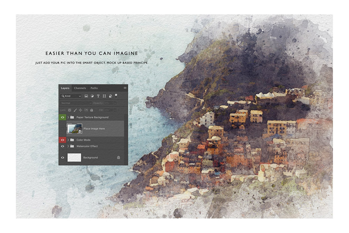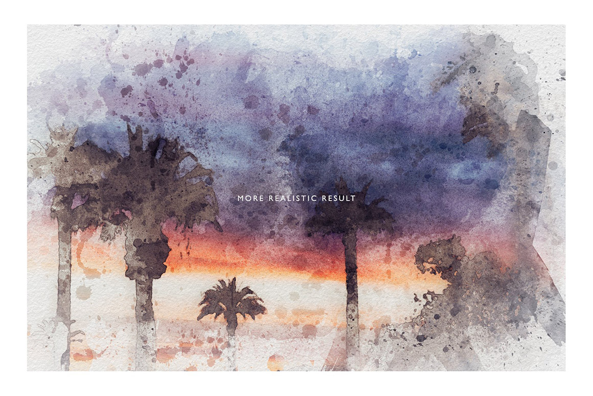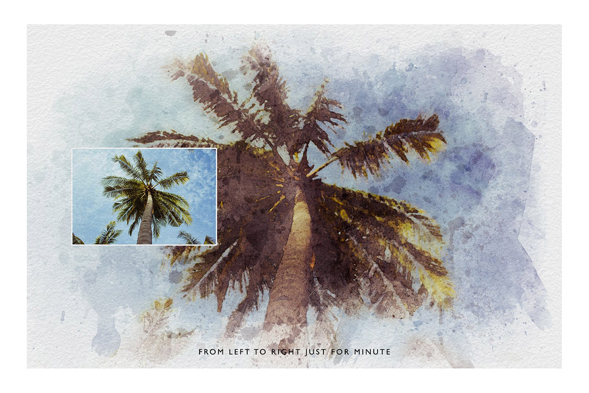 Don’t spend your time, just open this PSD file, add your image and get the watercolor illustration. The mock-up based principe. Easier than you imagine – no actions, no brushes, just one PSD file.