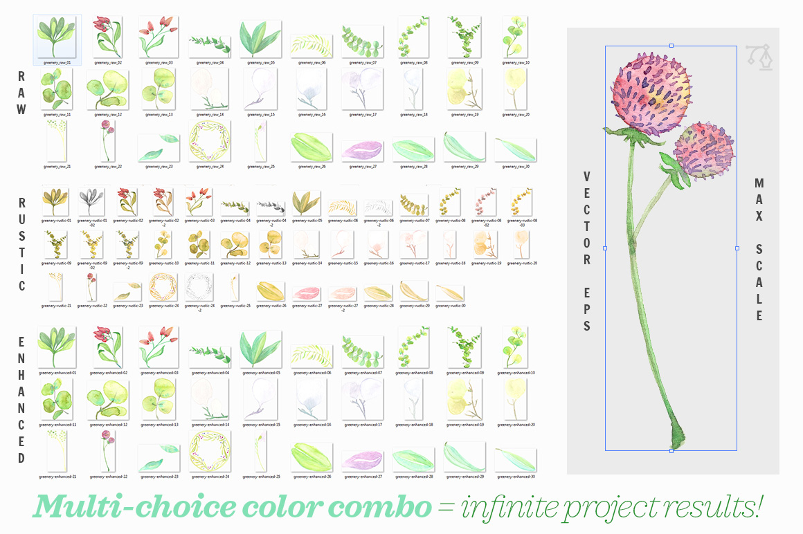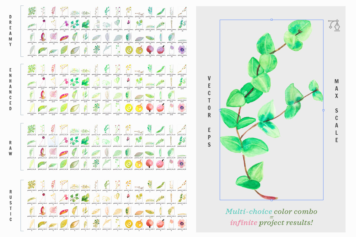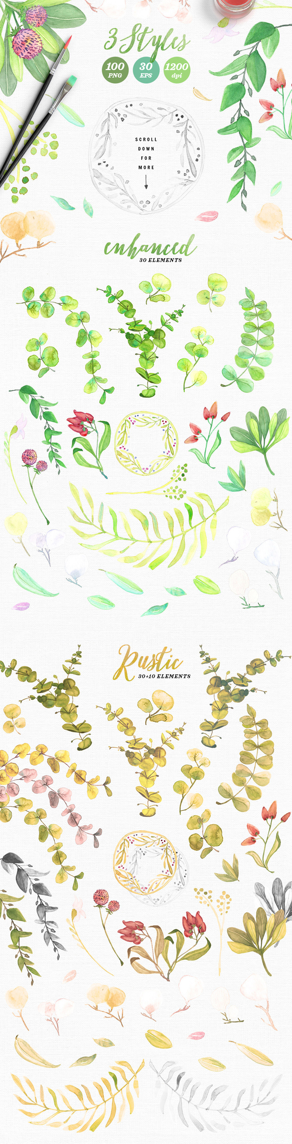 - 1 large EPS Set: 180 fully scalable vector files for the Enhanced, Dreamy, and Rustic version of the elements.