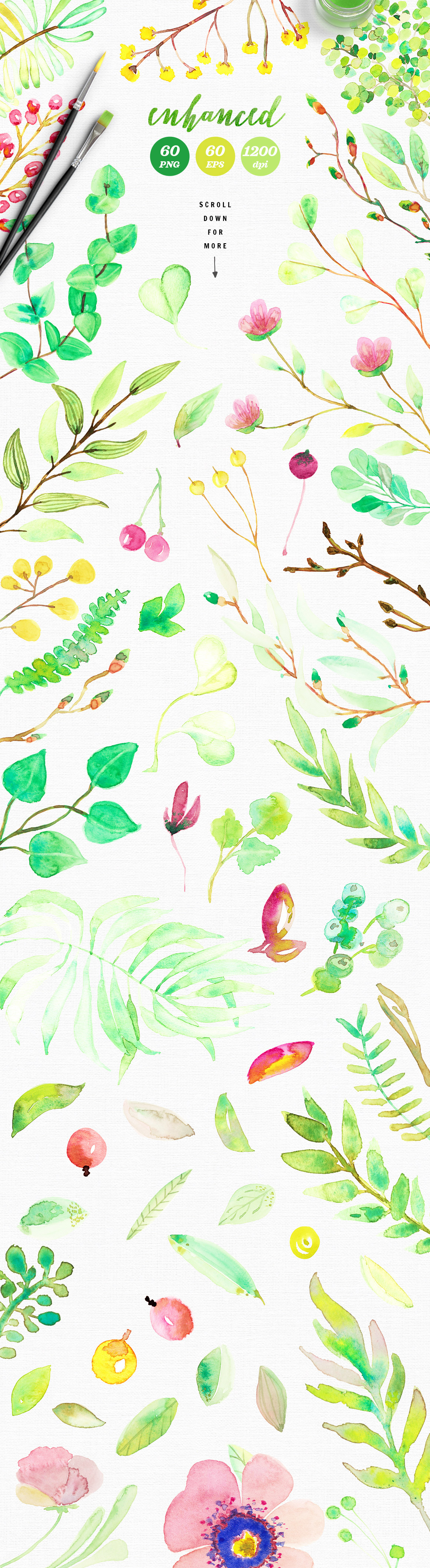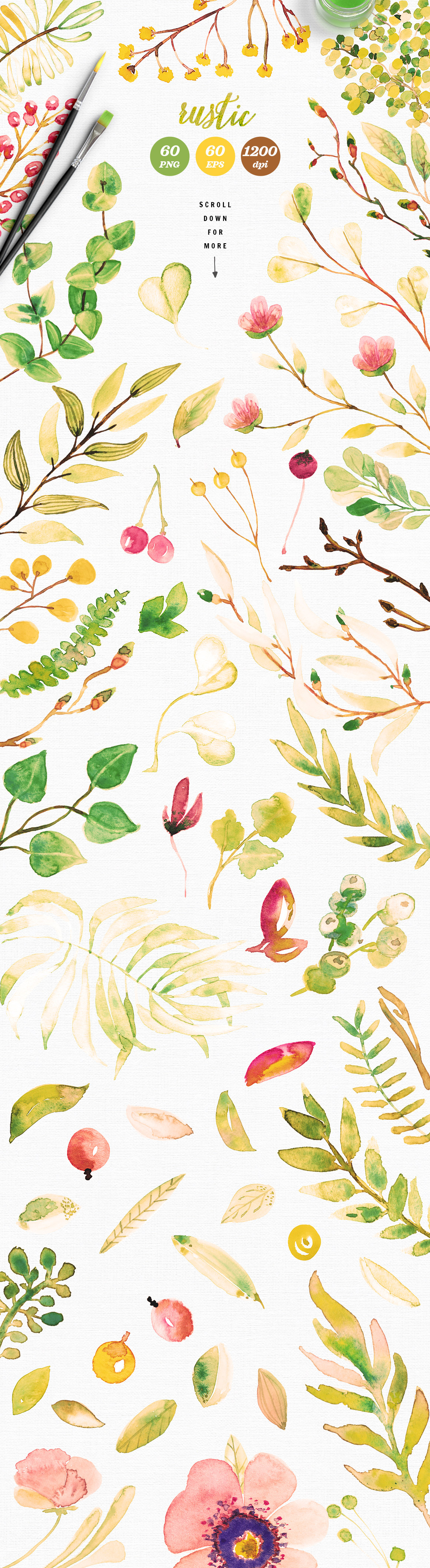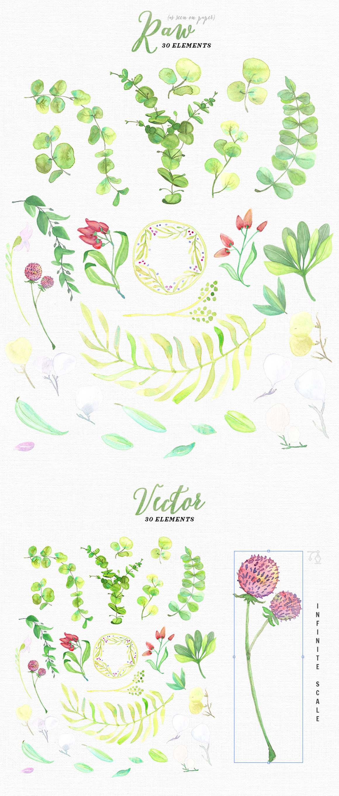 - 1 large EPS Set: 180 fully scalable vector files for the Enhanced, Dreamy, and Rustic version of the elements.