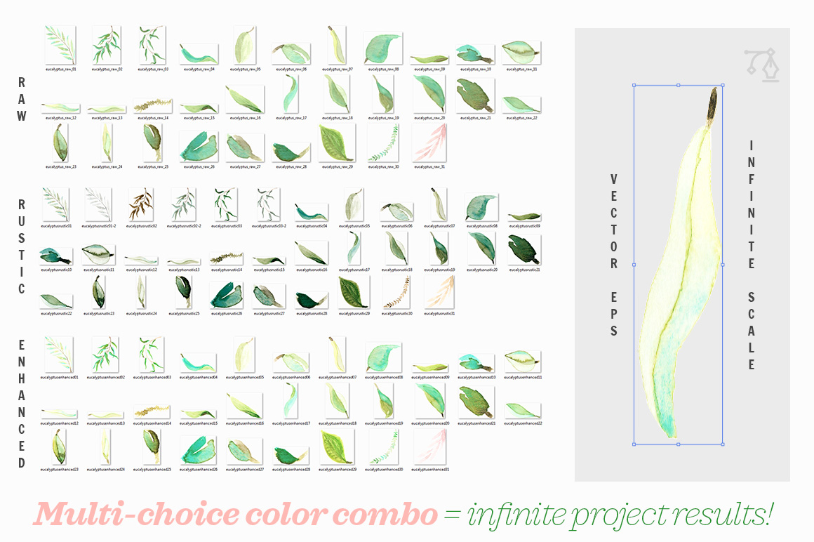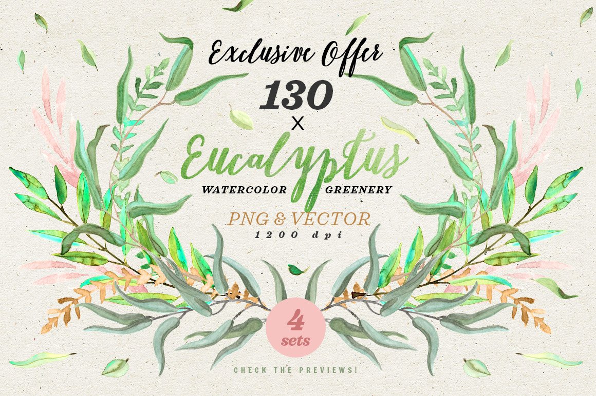Hello Greenery Lovers! Just launched this incredible superset comprising hi-res eucalyptus goodies for you, to fast add/edit your botanical inspired projects! Yay! The BUNDLE is loaded with 680+ ready-to- use files! This means that the whole floral set has transparent background, therefore it can be used as PNG files aaaand…fully scalable vector files (.eps)! Awesome, right?