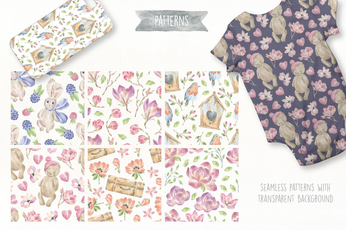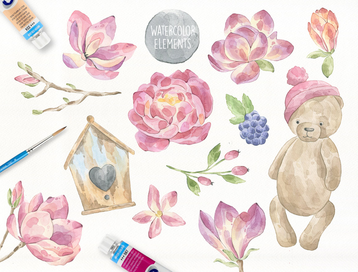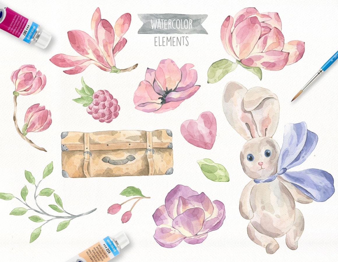 - WATERCOLOR OBJECTS [ It’s 44 beautiful watercolor elements : rabbit, bear, flowers, florals, bird and other elements ]