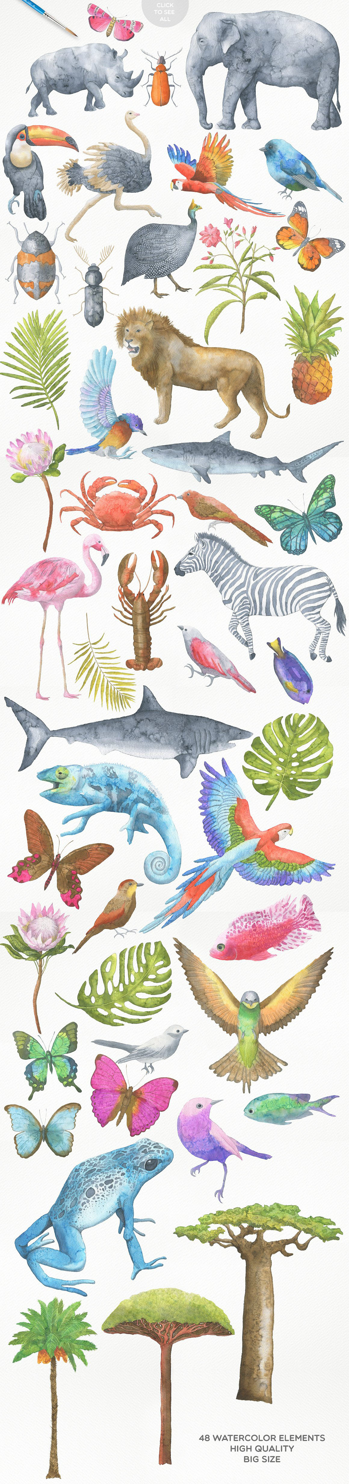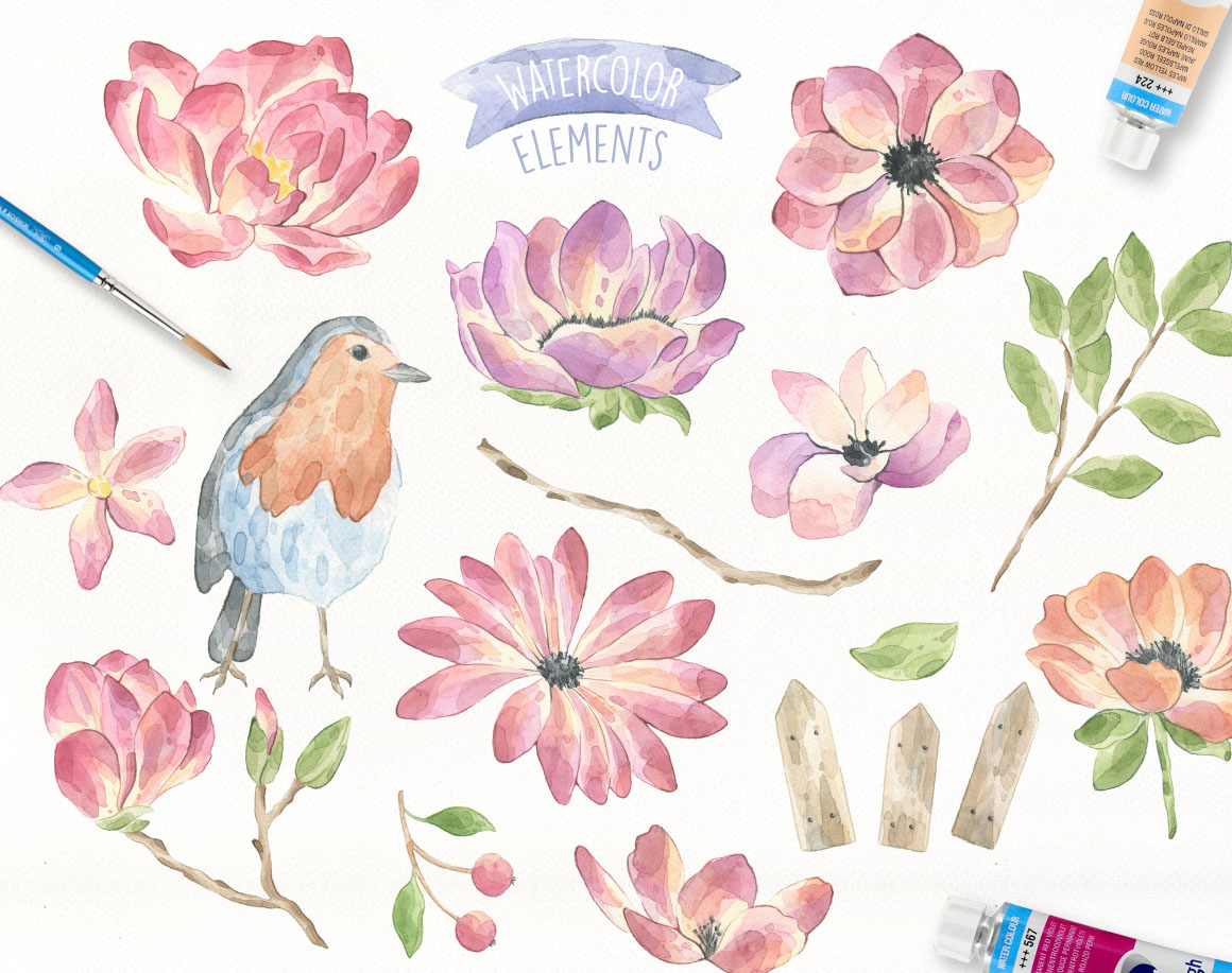 - WATERCOLOR ELEMENTS [ It’s : animals, birds, flowers and etc. Each object saved in PNG format with transparent background]