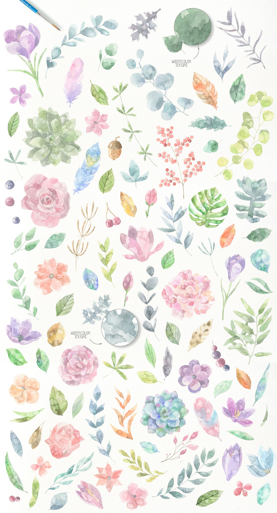 - WATERCOLOR OBJECTS [ It’s 105 watercolor elements : leaf, flowers, berry and other elements ];