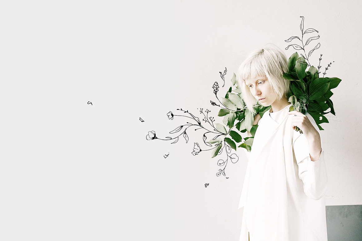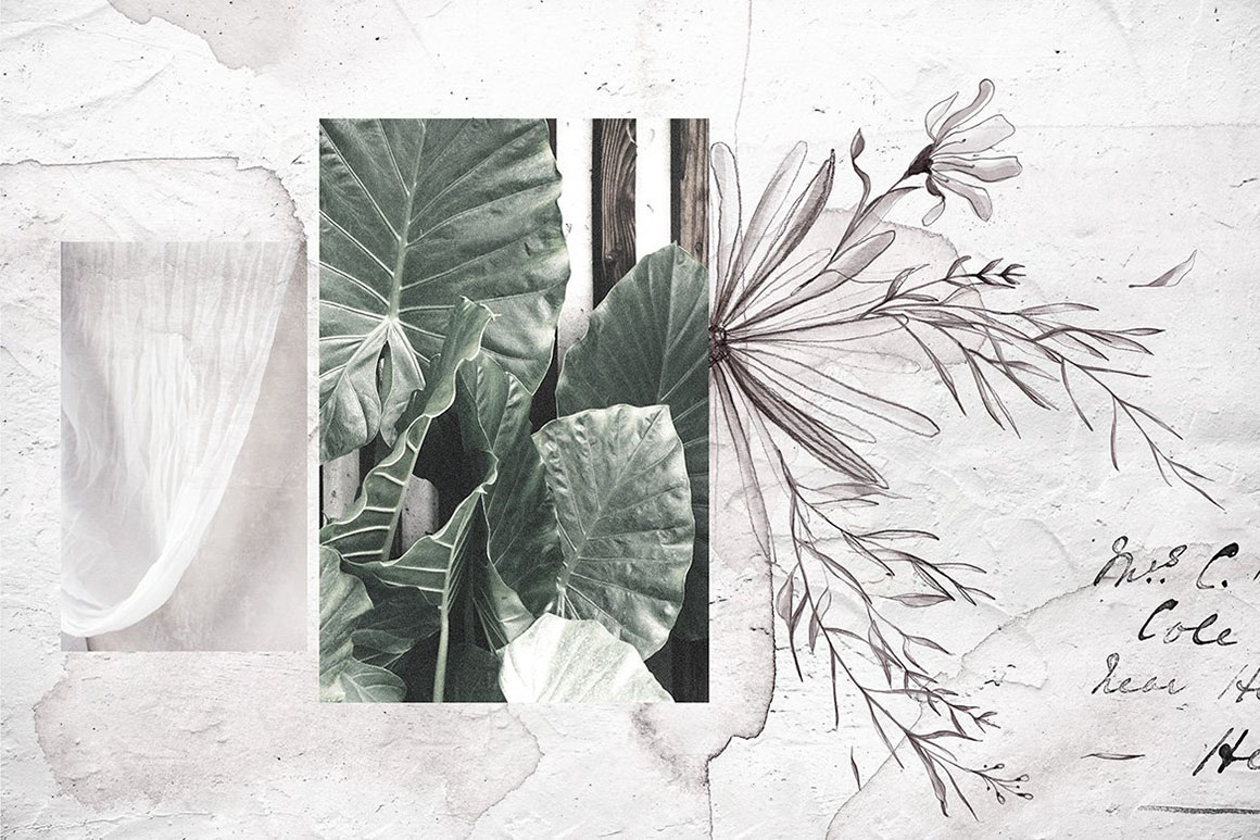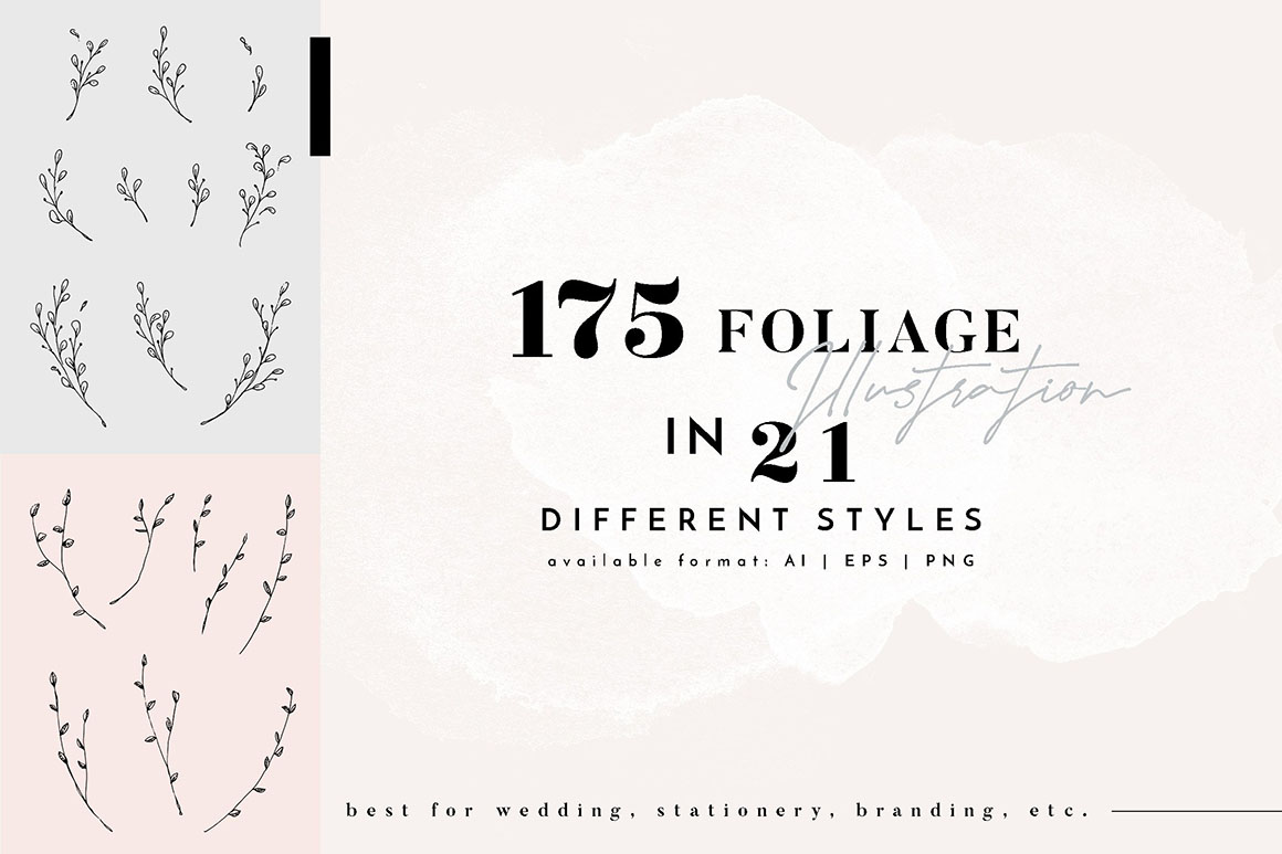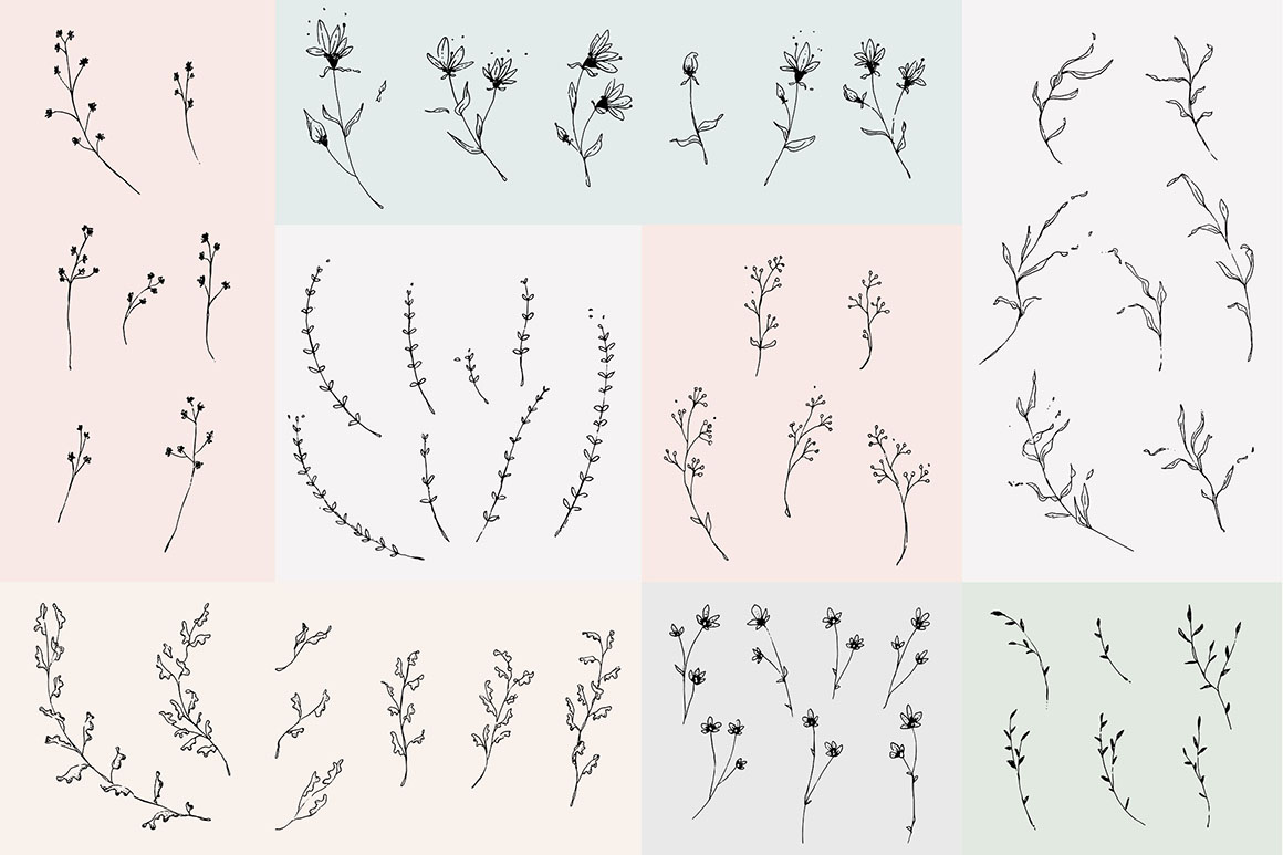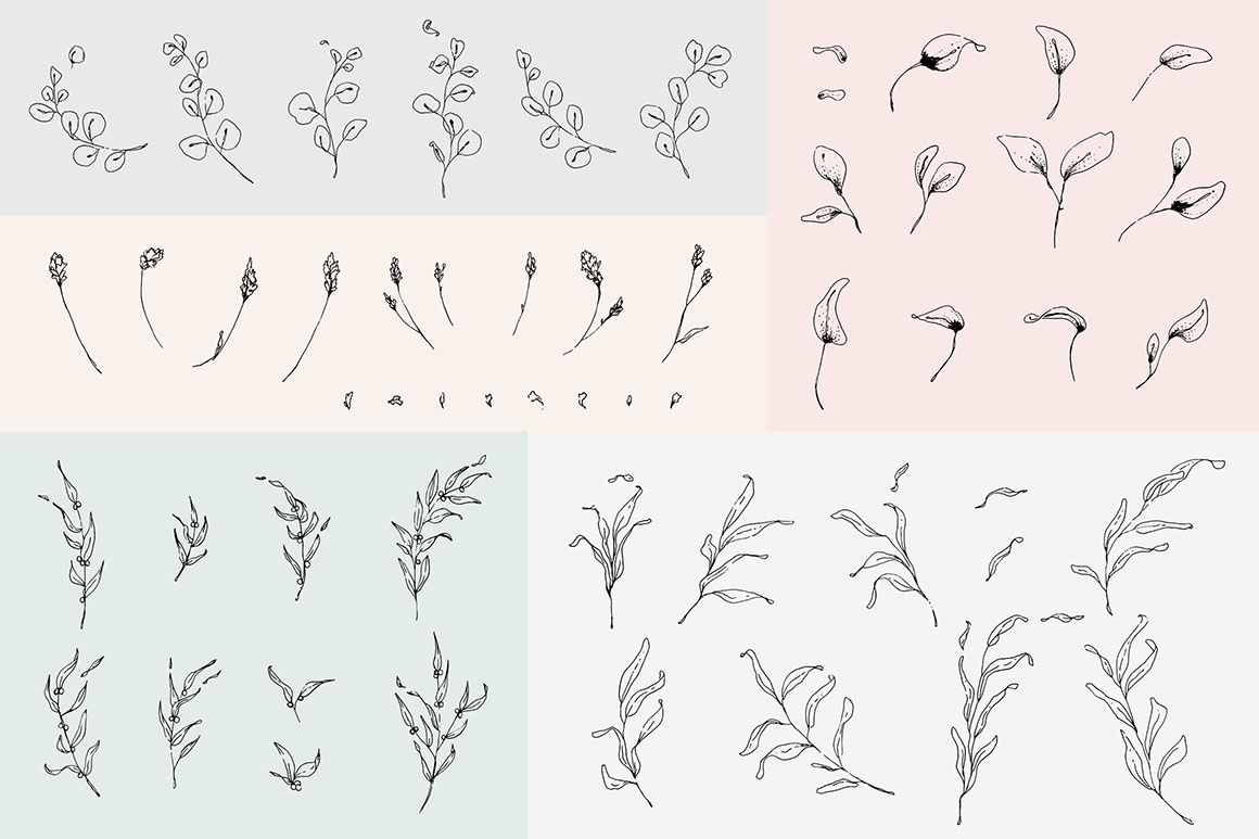 What you have in the package is various types of leaves, branches, flowers, also logo packs that combine all these illustrations with modern serif, sans serif and modern calligraphy.
