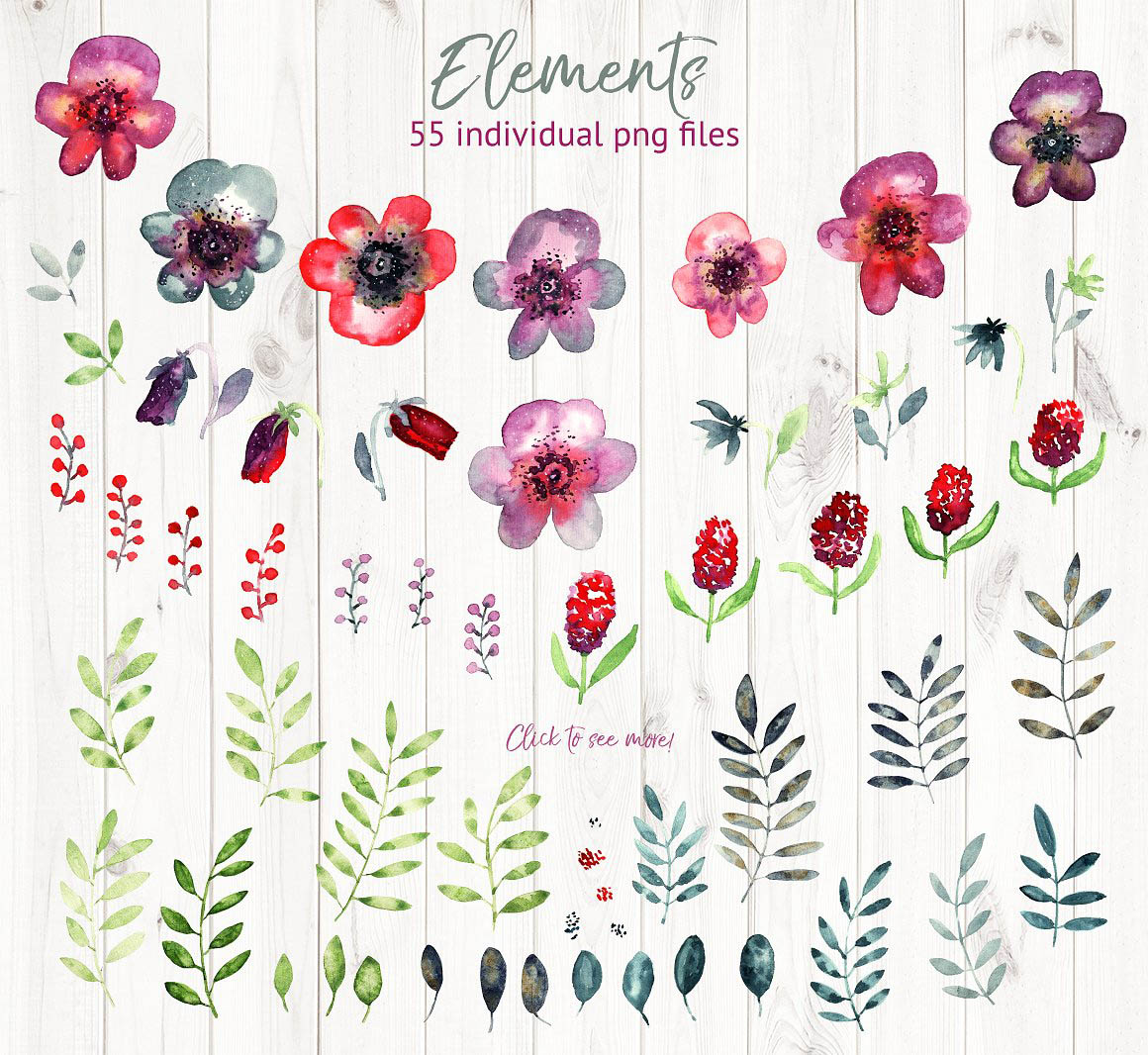 - 55 individual elements (flowers, leaves, etc.) in PNG files with transparent backgrounds