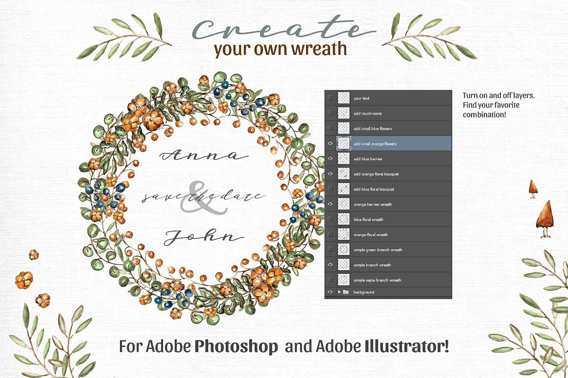- 1 Rustic Wreath Creator in Adobe Illustrator AI file (note: all elements are embedded as PNG and not vector!)