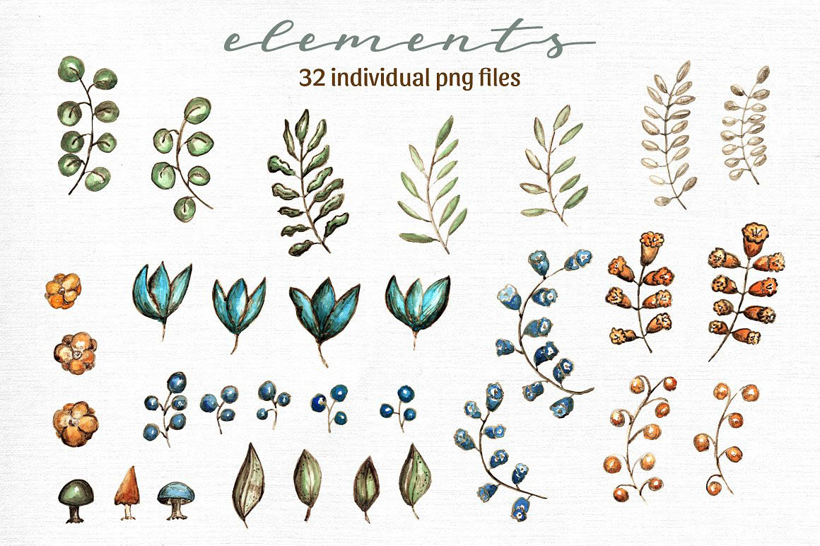 - 32 individual elements (flowers, leaves, etc.) in PNG files with transparent backgrounds
