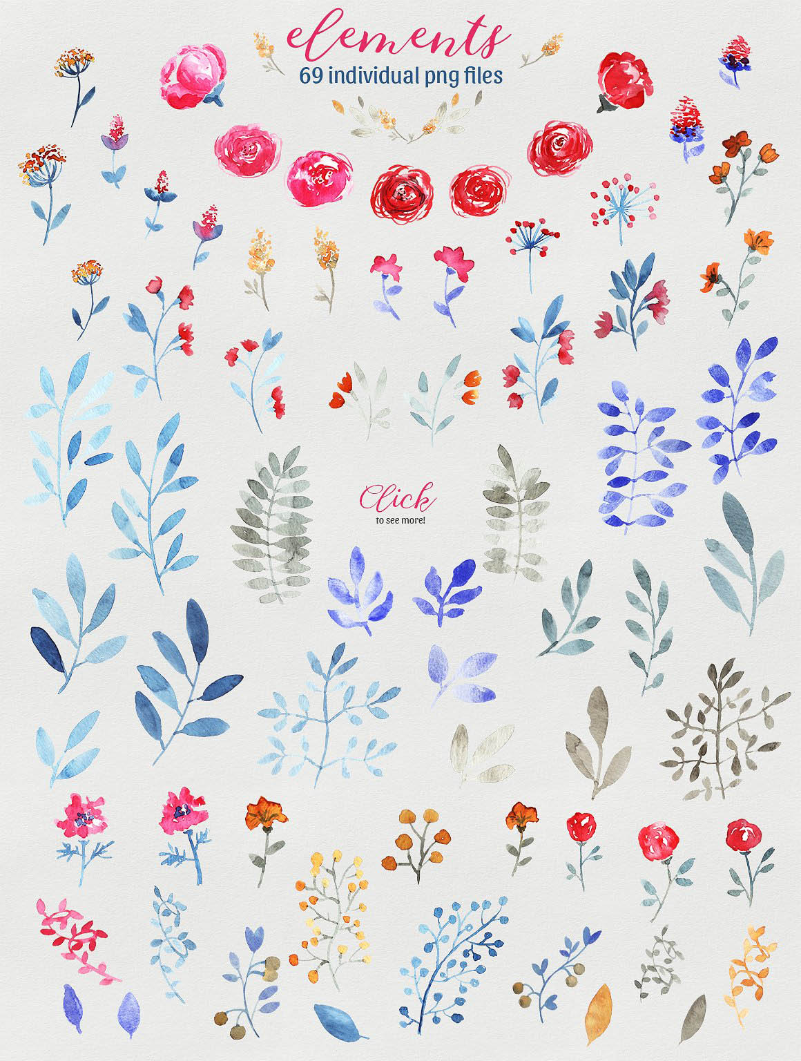 - 69 individual elements (flowers, leaves, etc.) in PNG files with transparent backgrounds