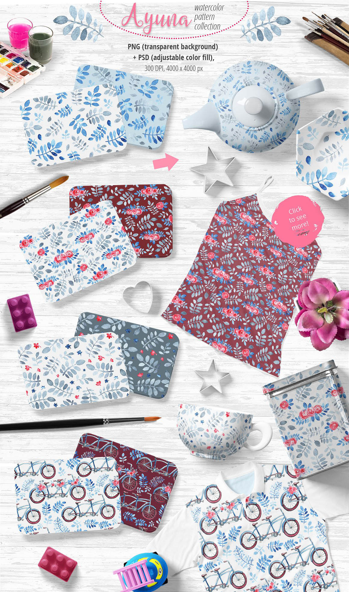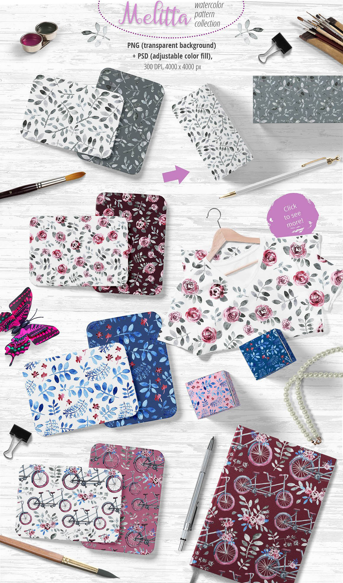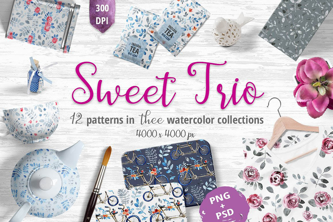I am glad to present you watercolor set of Sweet Trio patterns. These patterns are suitable for textile and fabric design, decorative products, packaging, scrapbooking. Enjoy! 🙂 12 patterns are divided into 3 watercolor collections. Each collection has 4 patterns.