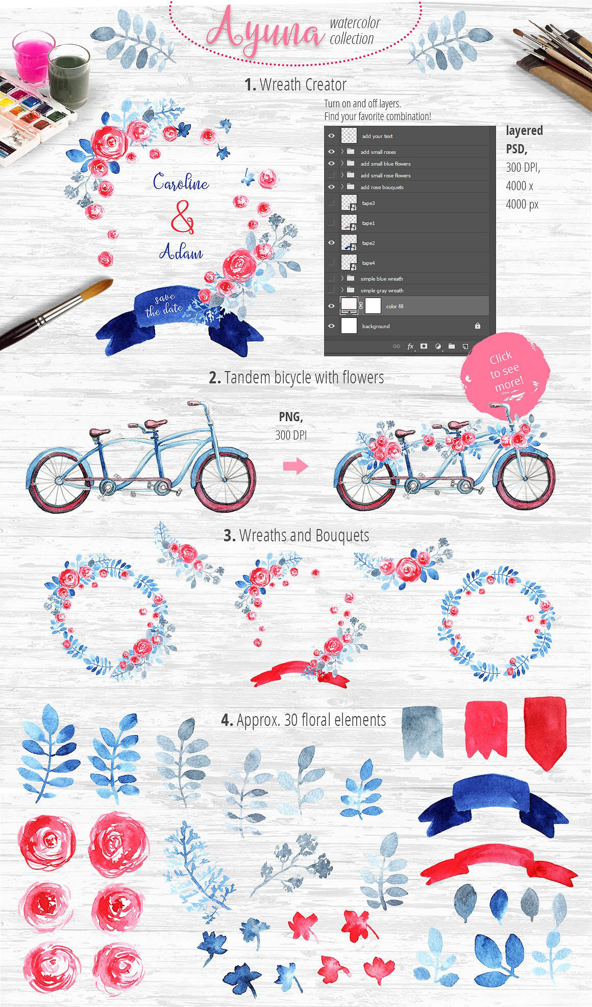I am glad to present you gorgeous Trio of Duos: 3 Wreath Creators and 3 tandem bicycles! Together they make up three watercolor collections. Colors are chosen so that you can combine wreaths and tandems in different ways, creating new accents. Each of the Collection includes hand painted floral elements and tapes, created with gentle shades of watercolor. This is a great tool to create a special design in a single style. Besides, it’s fun and interesting. And of course it is perfect for wedding cards. Find the combinations that you like!