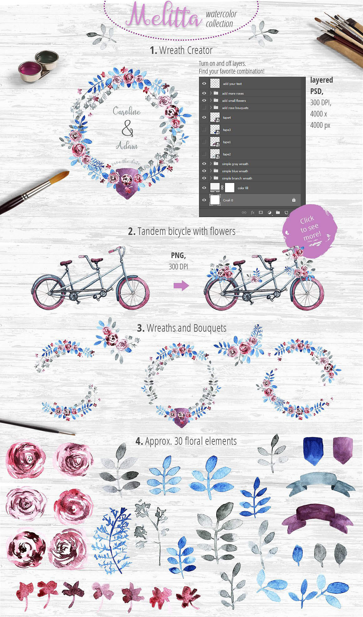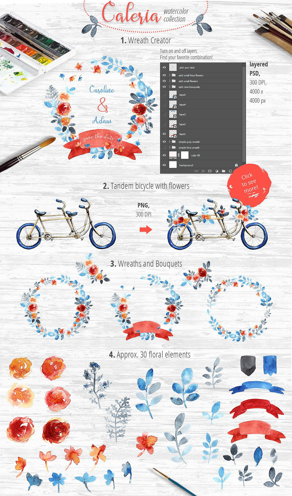 Normally, these 8 watercolor bundles would cost you $77 (without extended licenses), but for a limited time only, you can get this unique collection with extended license for $14!
