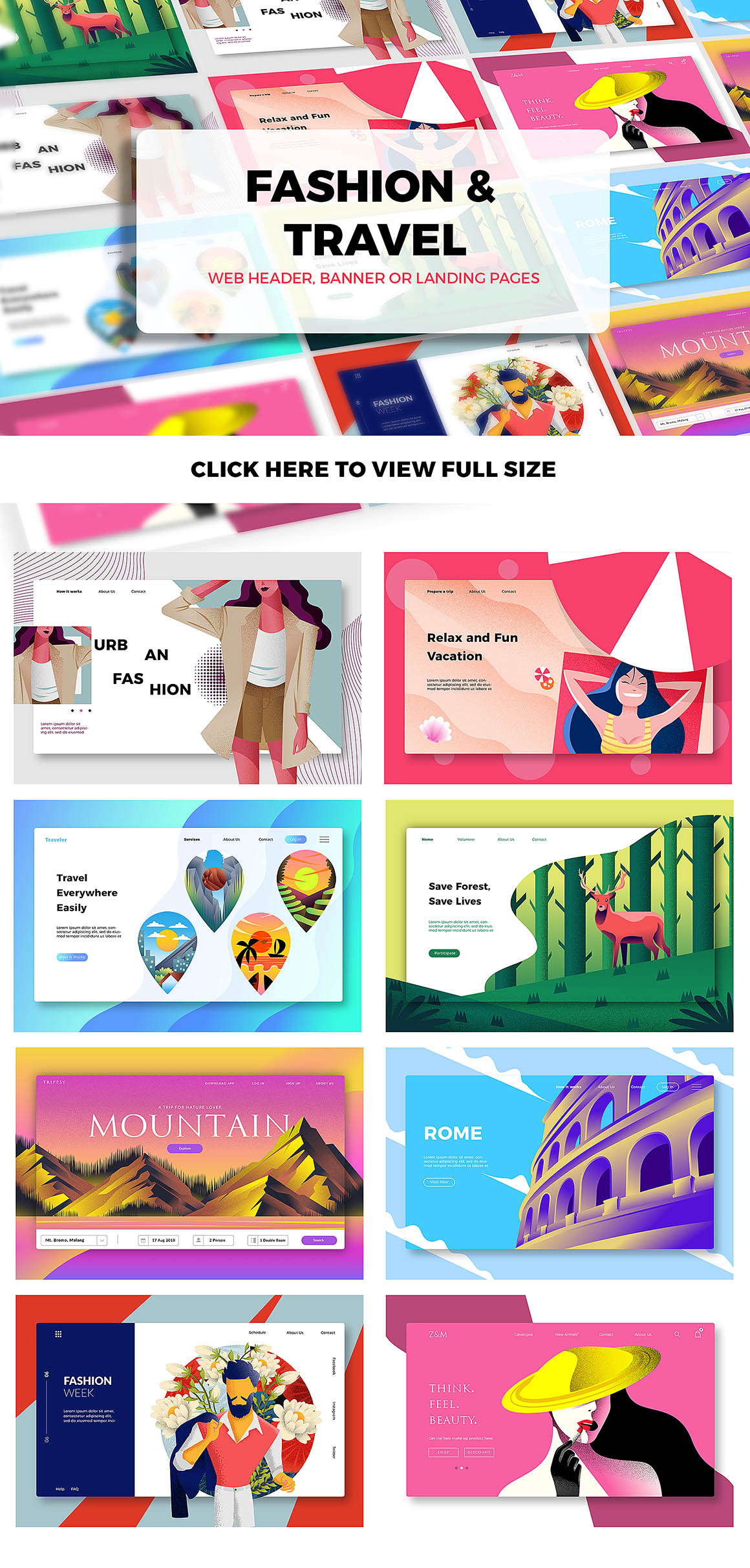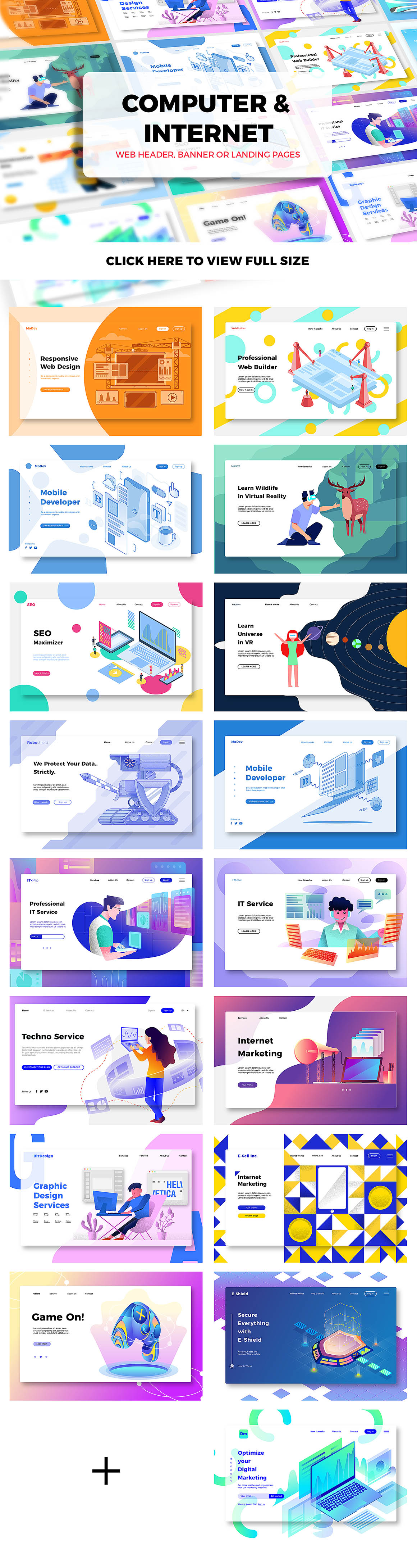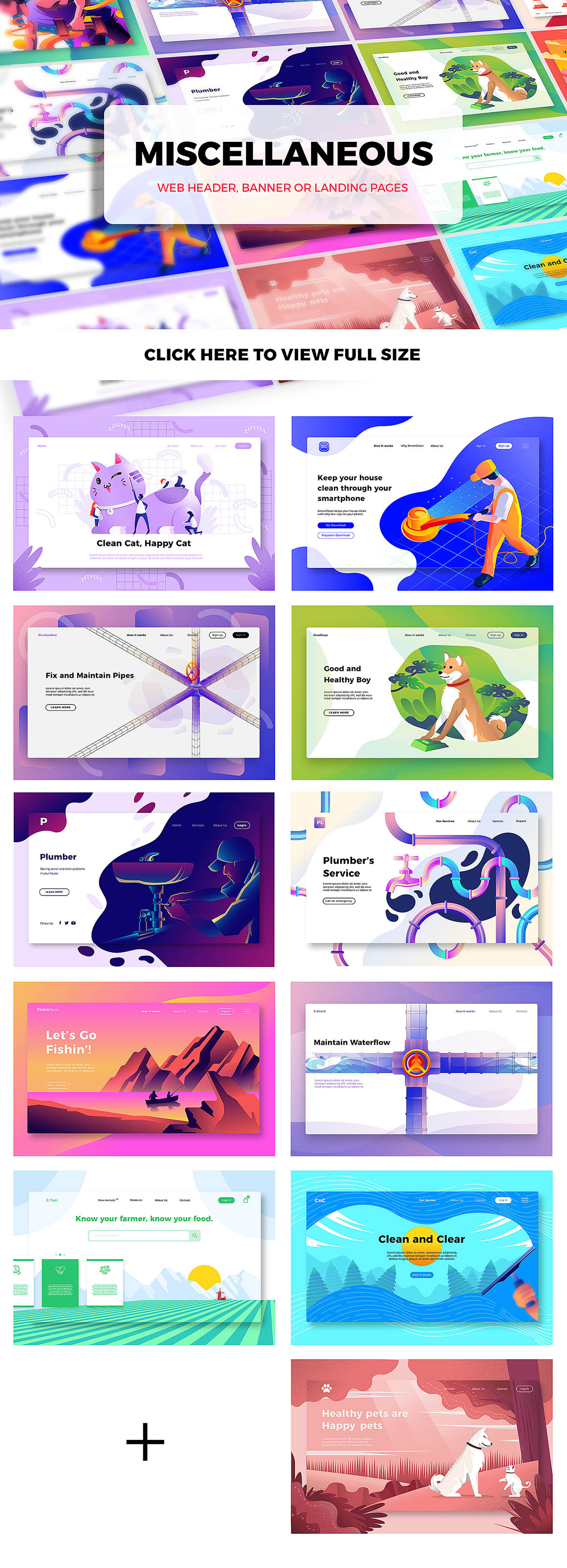 Web Headers Or Vector Illustrations from aqr Studio contains 130+ vector banners or landing pages in 14 sets! Don’t miss this vector illustration graphics bundle and create your own modern artworks for you, customers or for sale! Great for websites, promo banners, print promotion or magazine design, social media promotions, packaging…basicly any place you’ll like (web or print)!