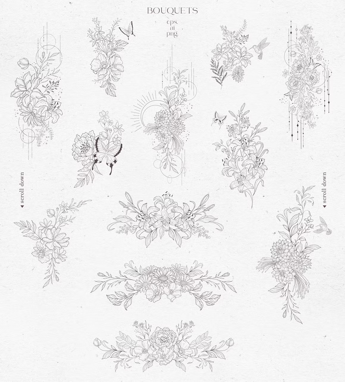 All these elegant & detailed hand drawn graphics from Designwork are ready for print or online use! MAIN USAGE: flyers, posters, greeting cards, branding, packaging, phone cases, bags and totes, wall art, fabrics, t-shirts, website backgrounds. Actually any place you love! Enjoy 😉