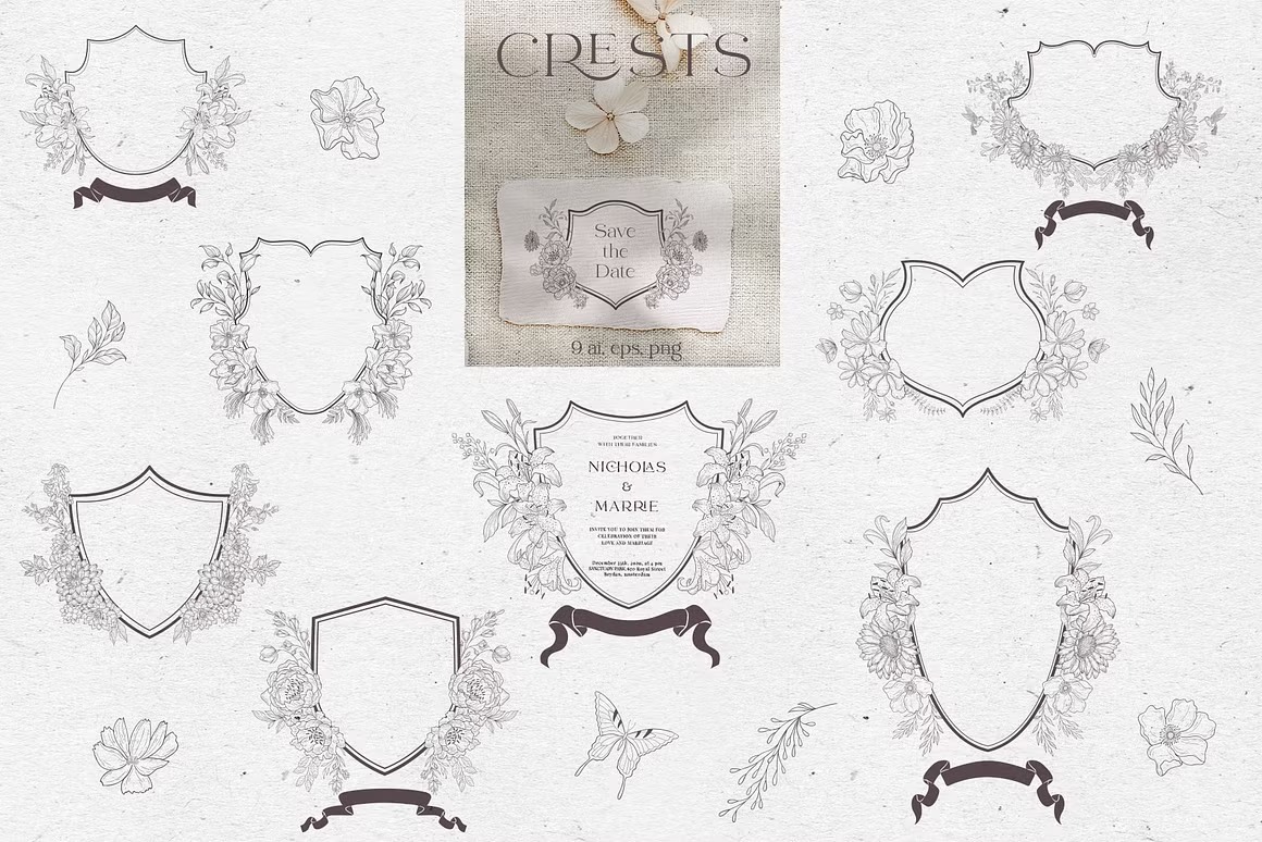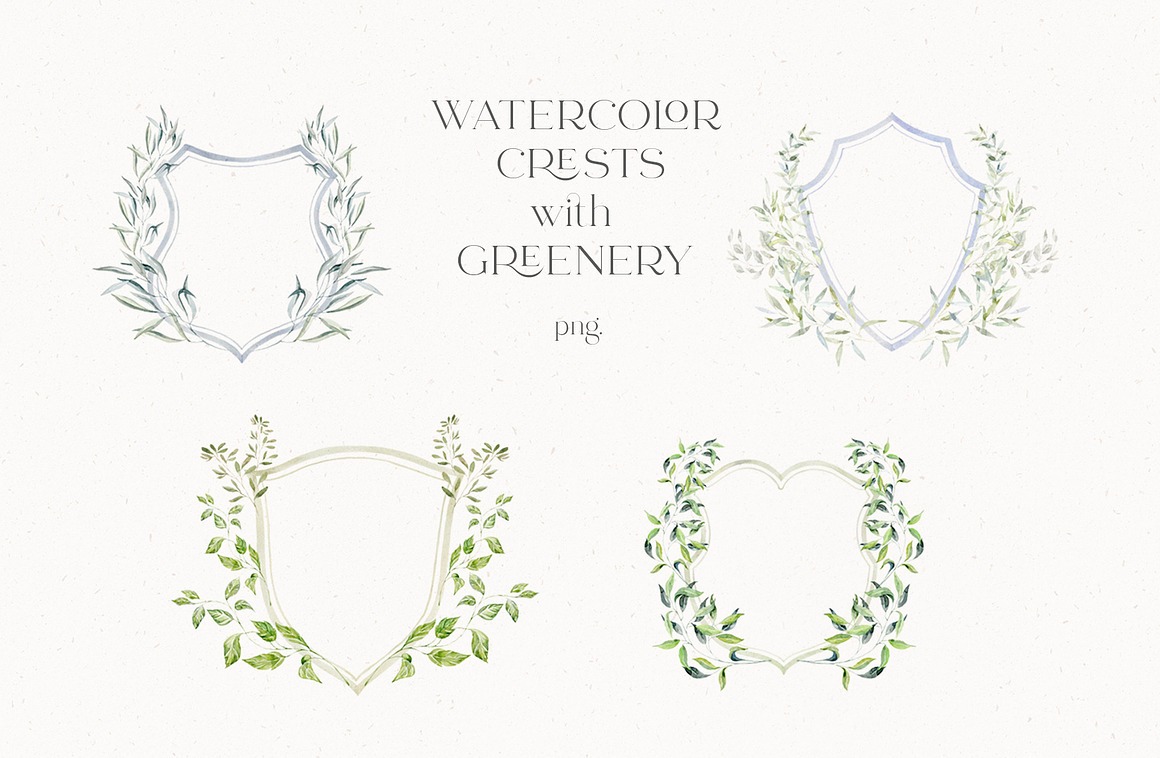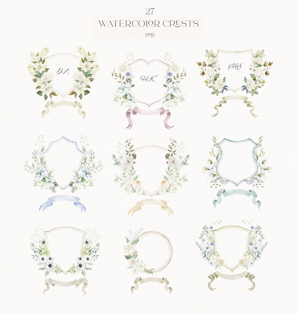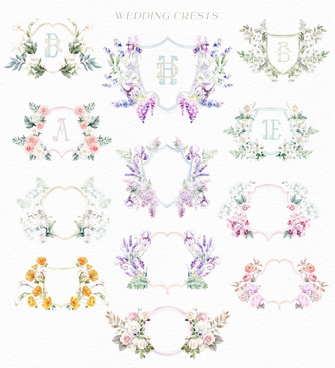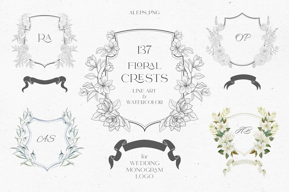 This collection included 137 ready Line art & Watercolor Crests. It’s perfect for wedding design, monogram, logo, cards, invitation and more …
