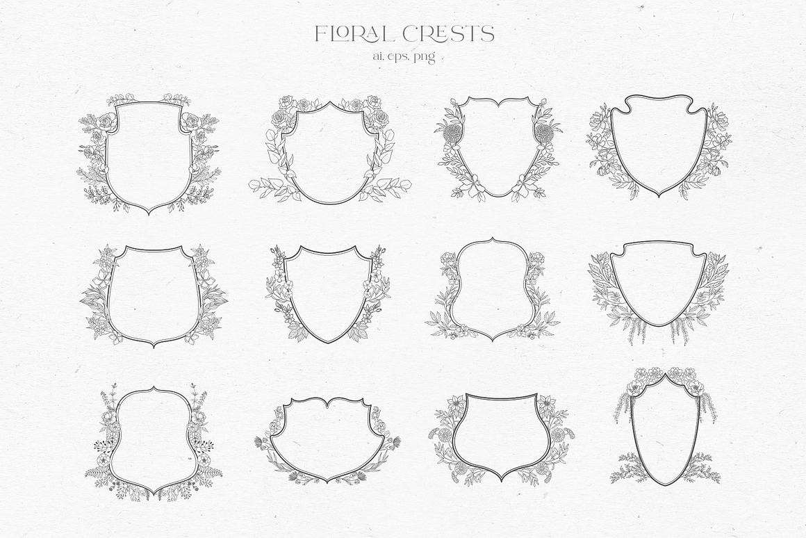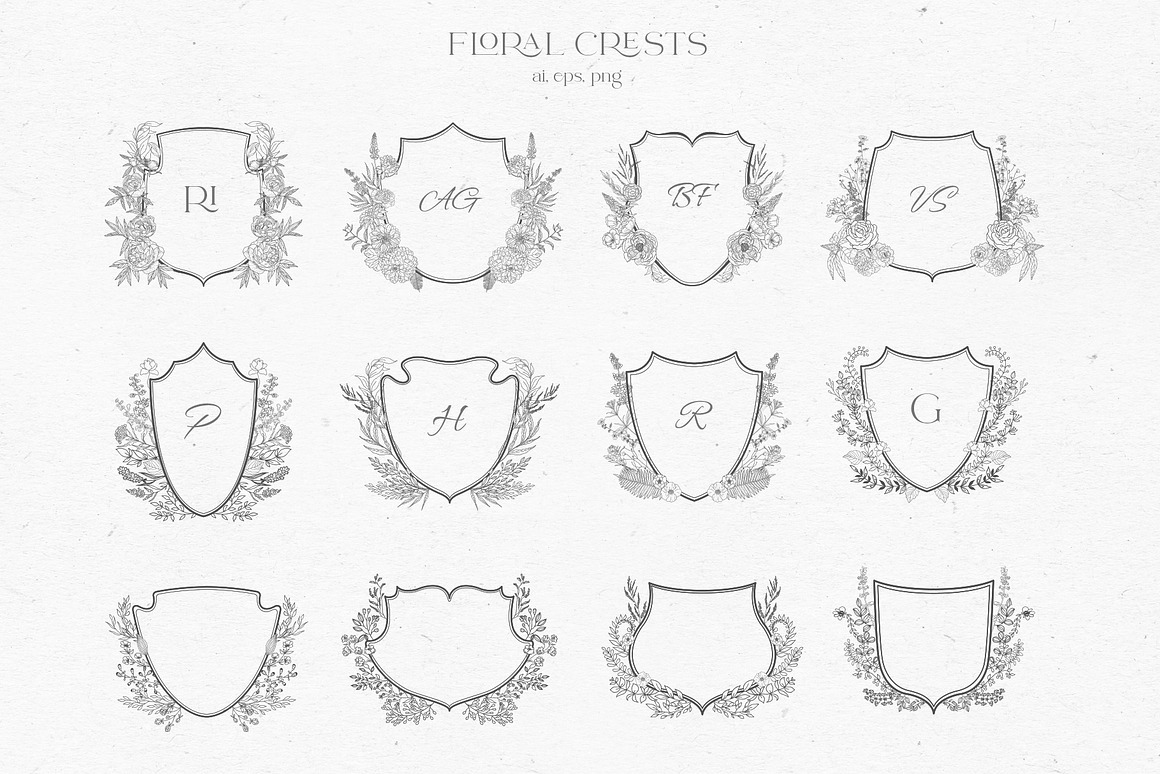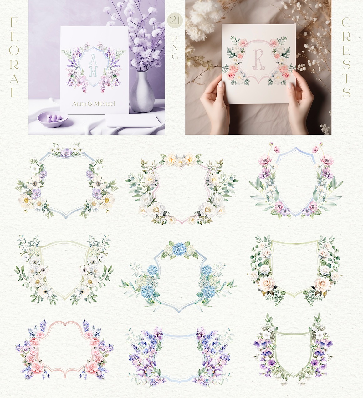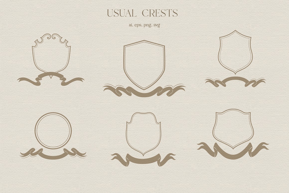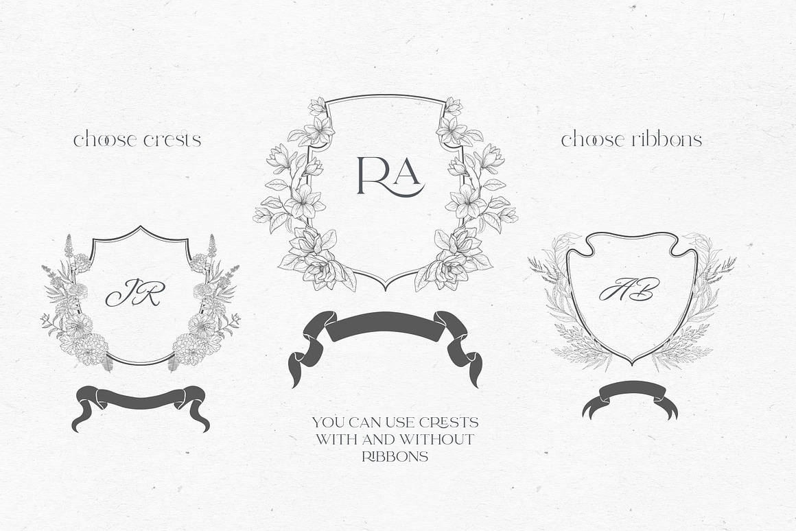 This collection included 137 ready Line art & Watercolor Crests. It’s perfect for wedding design, monogram, logo, cards, invitation and more …