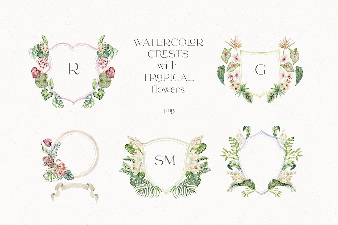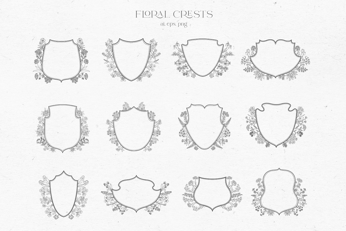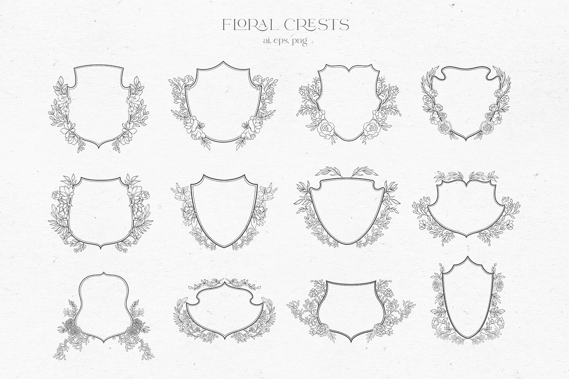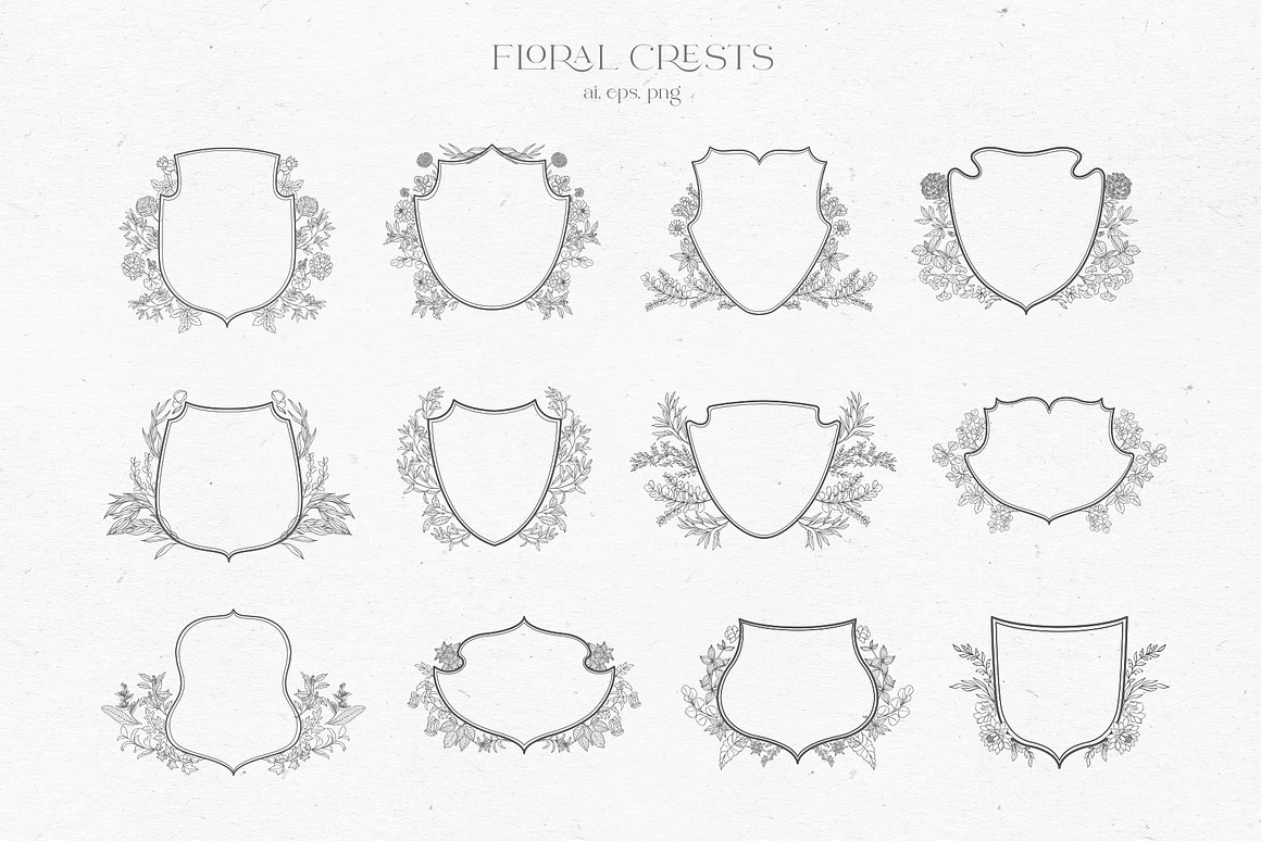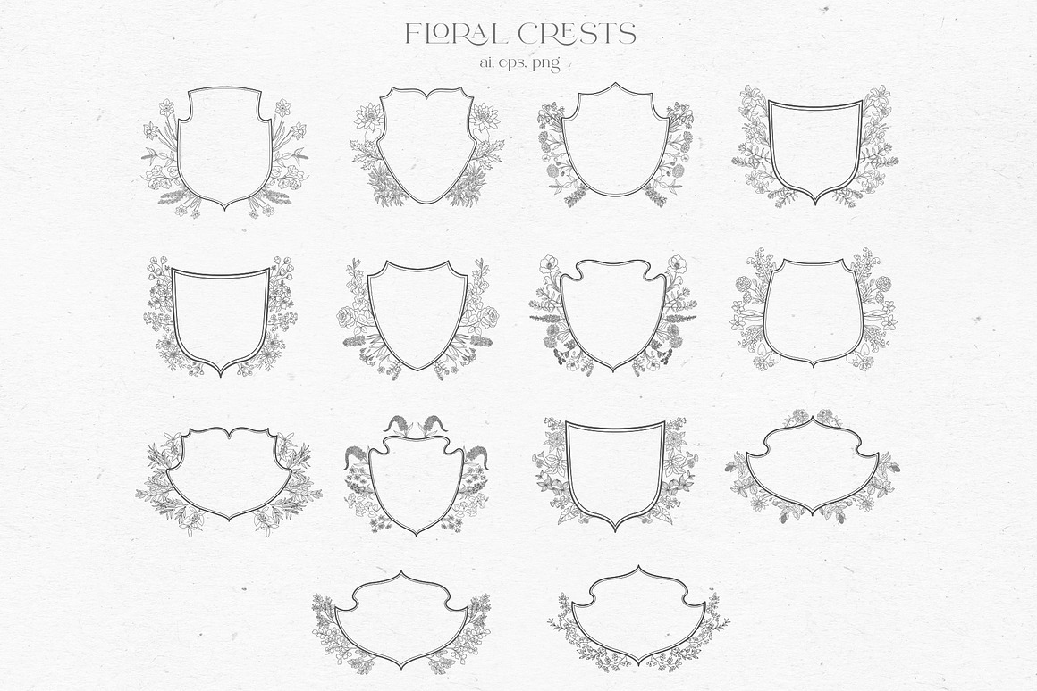 This collection included 137 ready Line art & Watercolor Crests. It’s perfect for wedding design, monogram, logo, cards, invitation and more …