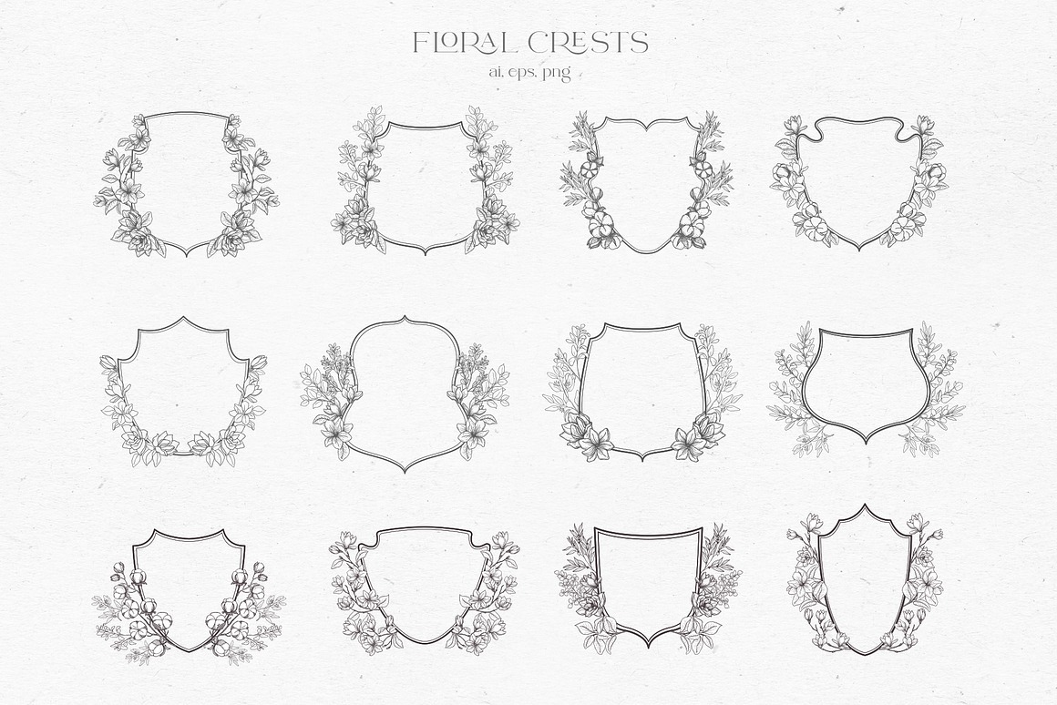 - 21 Floral Crests, ~2500x 3500 px, ~4500x 7800 px, PNG 300 dpi