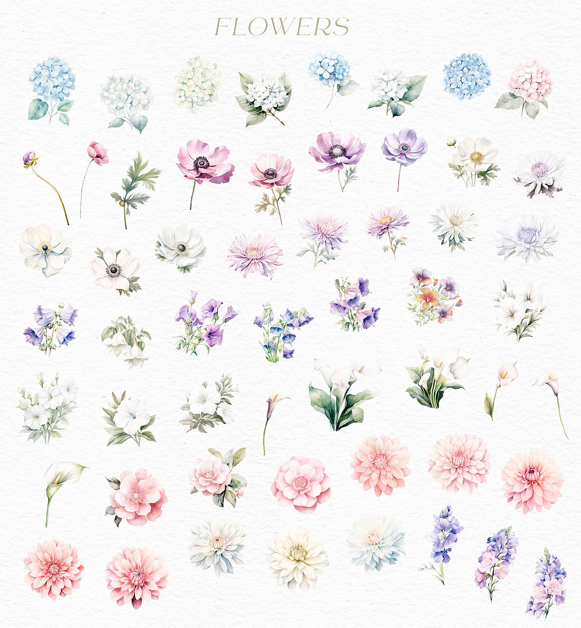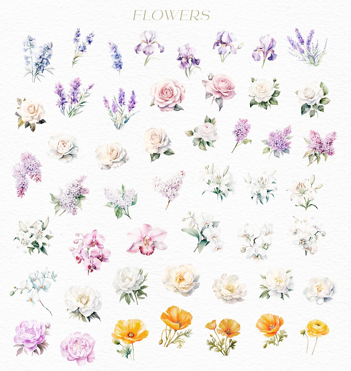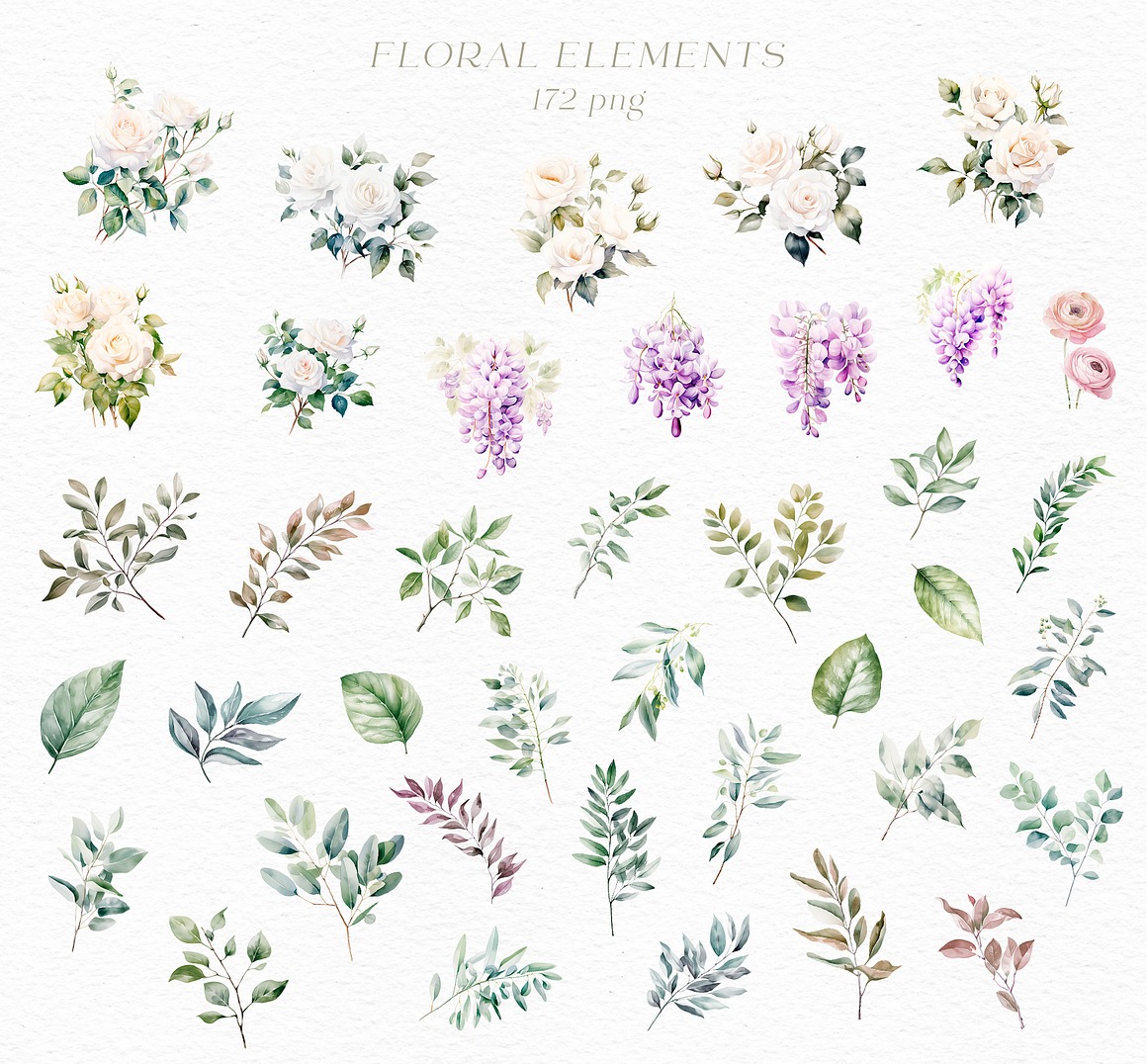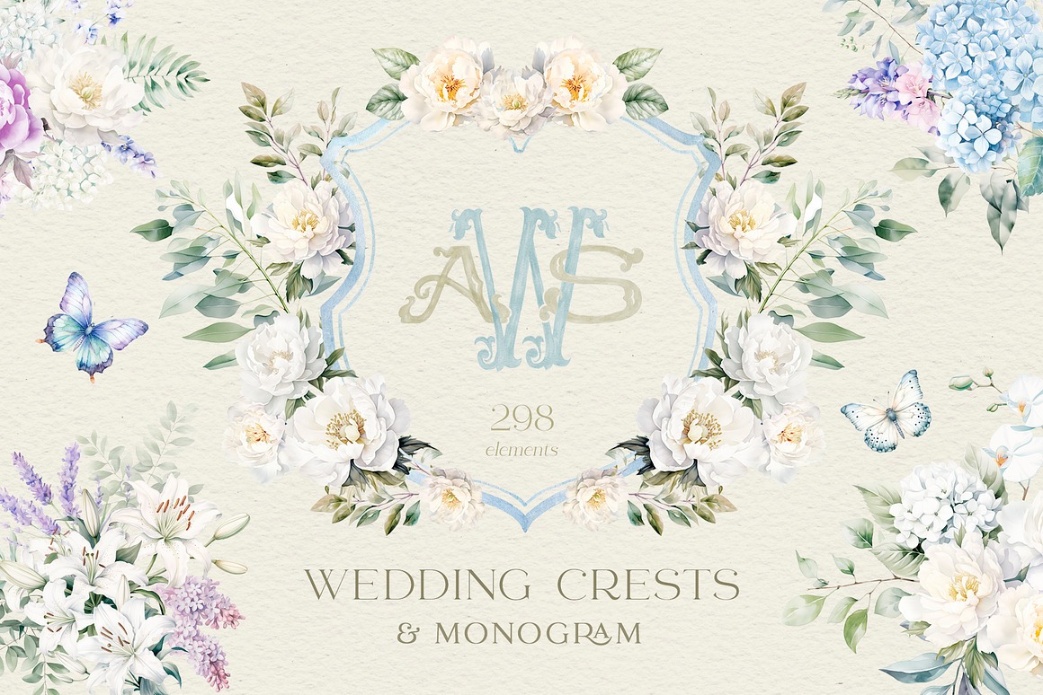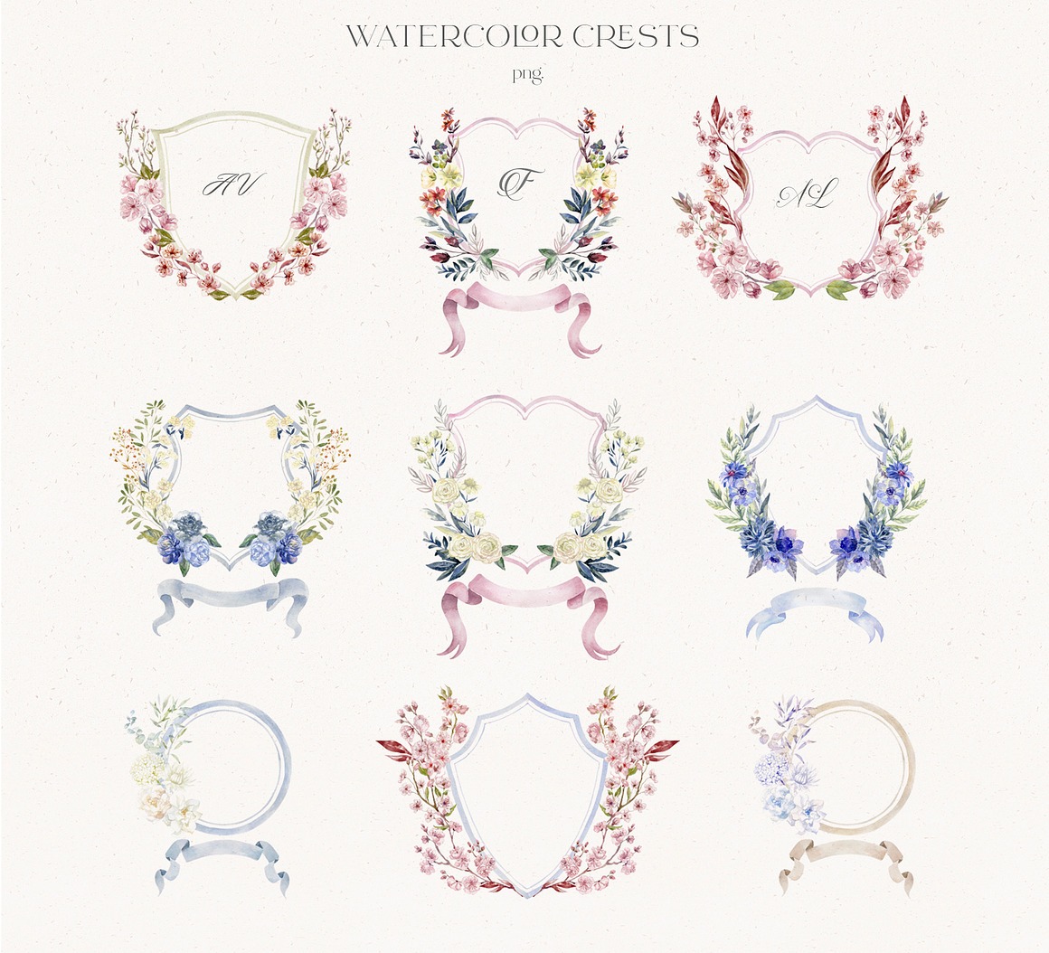 I’m glad to introduce you my new watercolor collection: “Wedding Crests & Monogram.” It included a lot of floral elements, two type of monogram, pre-made compositions of floral crests , frames, bouquets, butterflies. The elements from this product would look perfect for wedding, logo, birthday designs, greeting cards, invitations, fabrics, packacking, dishware design, patterns for stationery, gifts, prints for clothing, stickers and any more.