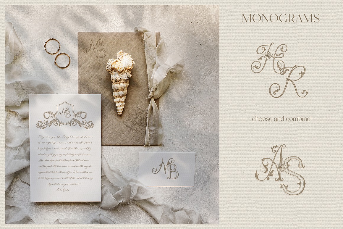 This collection included 245 design elements: 2 kind of Monograms, Crests, Ribbons, Bouquets, Frames, Flowers, Butterflies, Colibri and other design elements. It’s perfect for wedding design, monogram, logo, cards, invitation, certivicate, labels, tattoo and more …
