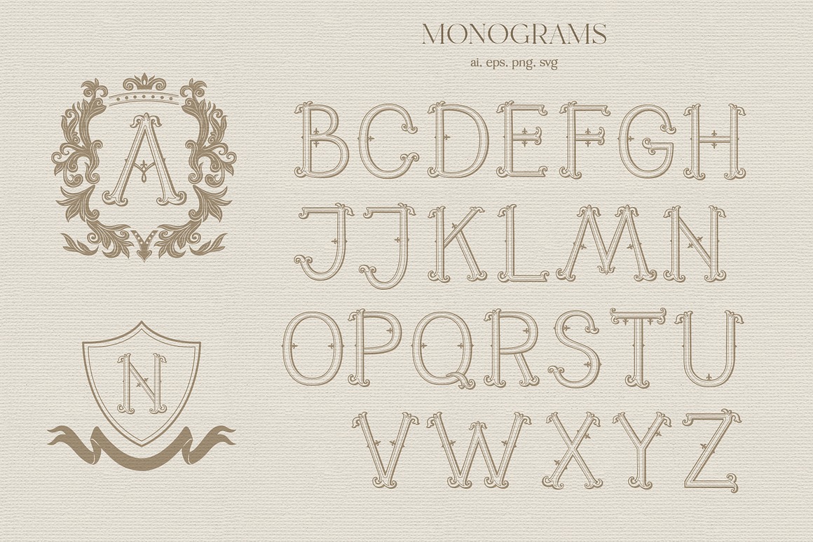 This collection included 210 design elements: 3 Alphabets for Monograms, Crests, Ribbons and Deco design elements. It’s perfect for wedding design, monogram, logo, cards, invitation, certivicate, labels and more …