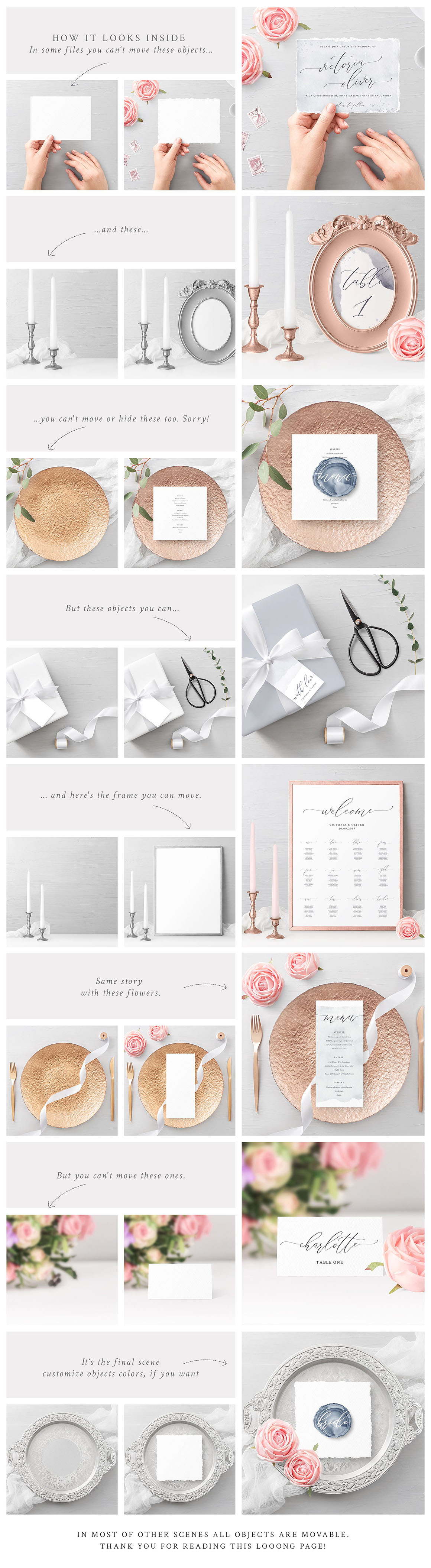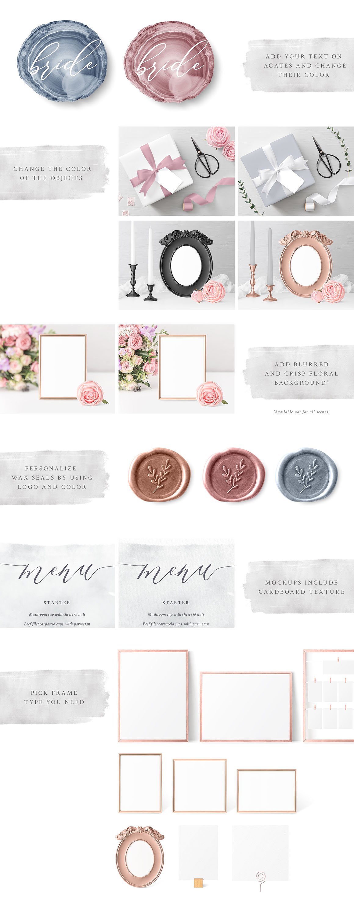 This product is perfect for displaying your wedding or other event stationery design to potential clients. Decorated with agates, candles, trays, faux and real flowers (roses, freesias, eucalyptus), ribbons, postage stamps. It comes in your favorite style: trendy ultraviolet wedding, copper, mauve, garden, blush, vintage wedding etc. So, it’s a product which you were waiting for 🙂