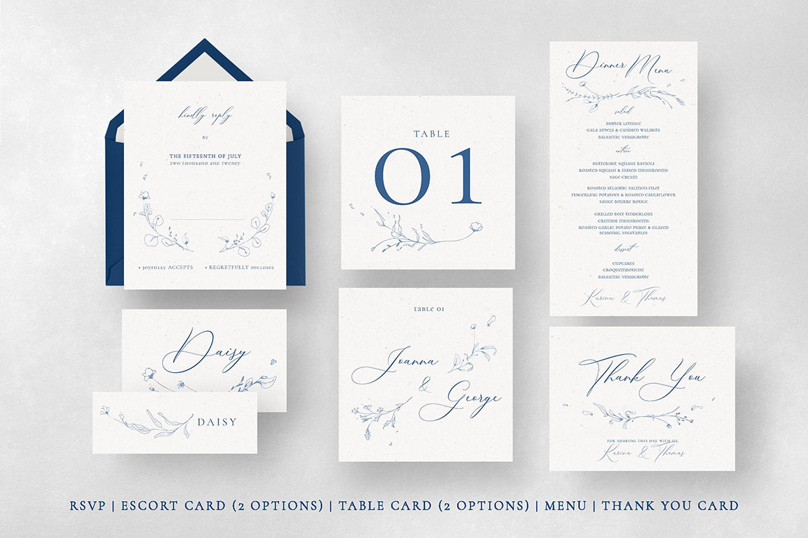 Sophisticated & simple wedding invitation design with a mix of thin hand drawn floral illustration & modern layout for your wedding celebration! What you have in the package is: wedding invite, save the date, RSVP, table number, escort card, menu card, and thank you card for your guest. All of them come in 2 palettes (peach & china blue style) and the details are very easy to edit, both changing the text & replacing the color. For the PSD files, the layers are well arranged & color highlighted, so you can customise it easily. And, a tutorial file is also included to help you change the text and color of the illustration.