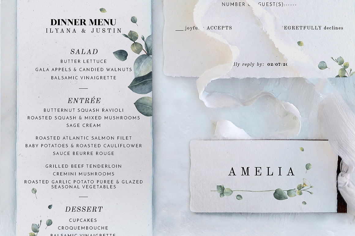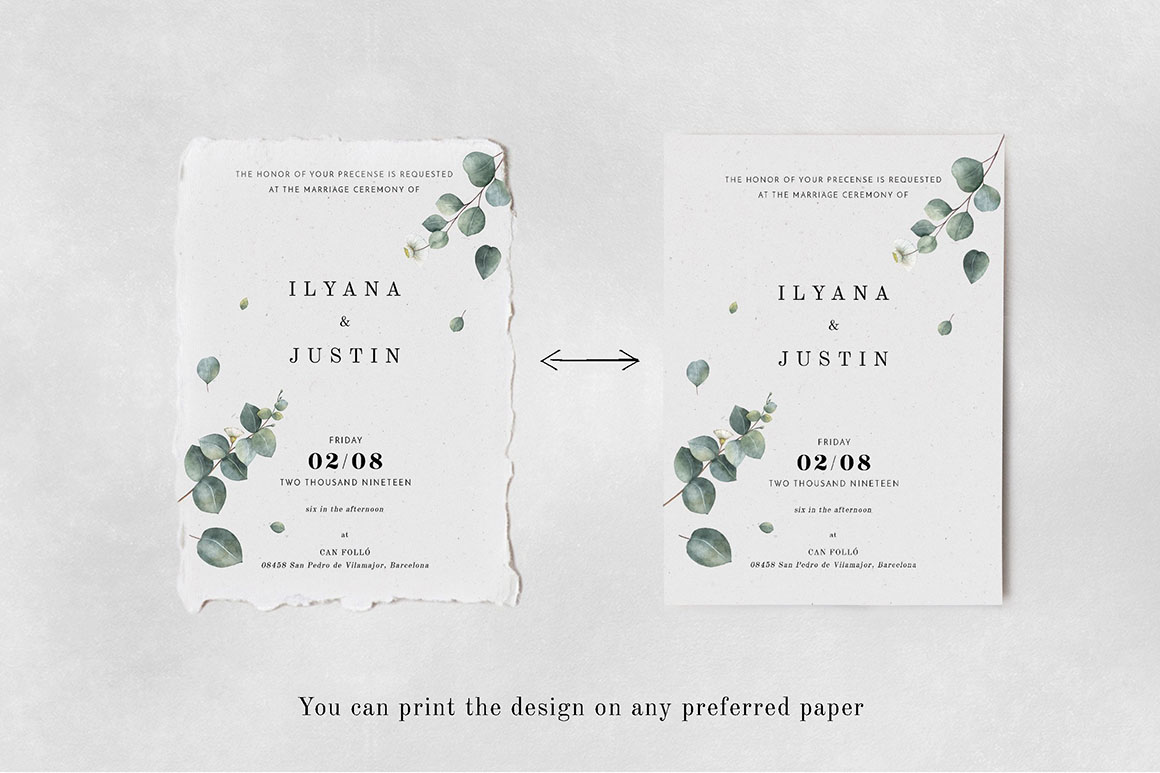 Sophisticated & elegant wedding invitation design with a mix of eucalyptus illustration & modern layout for your wedding celebration! What you have in the package is: wedding invite, save the date, RSVP, table number, escort card, menu card, thank you card and big wedding poster (welcome sign) for your guest, where everything is very easy to edit: text & color. For the PSD files, the layers are well arranged & color highlighted, so you can customise it easily.