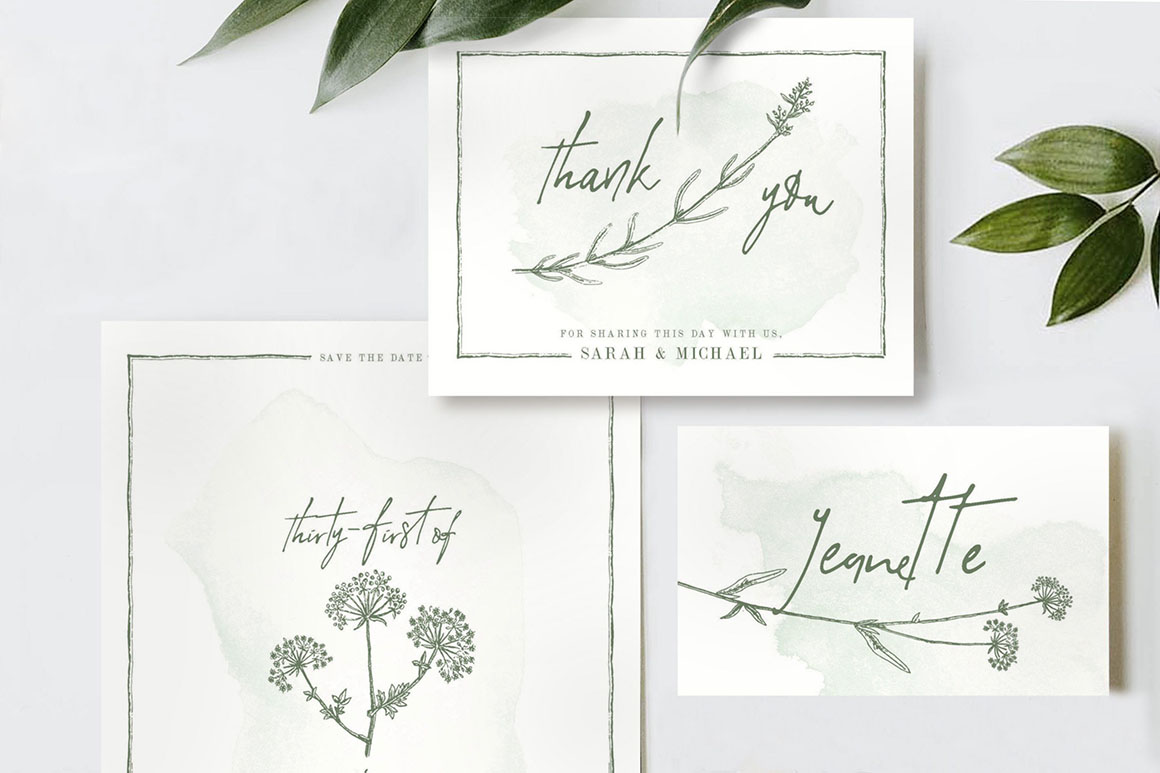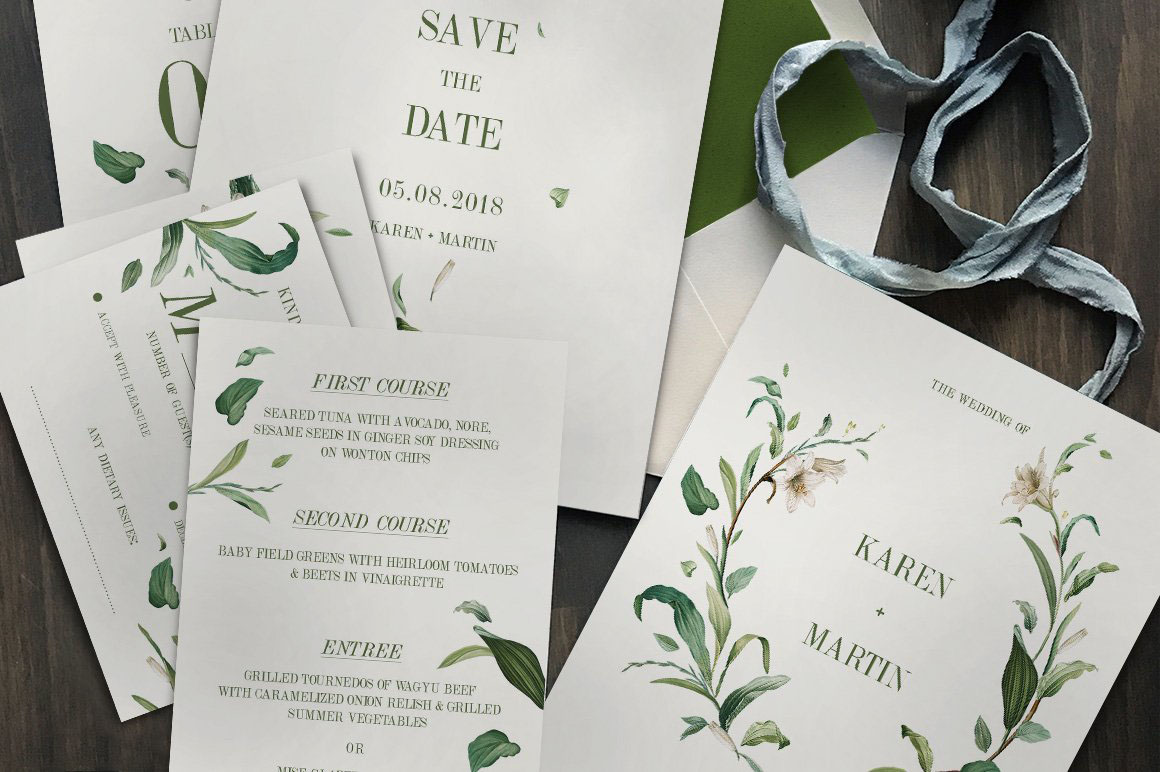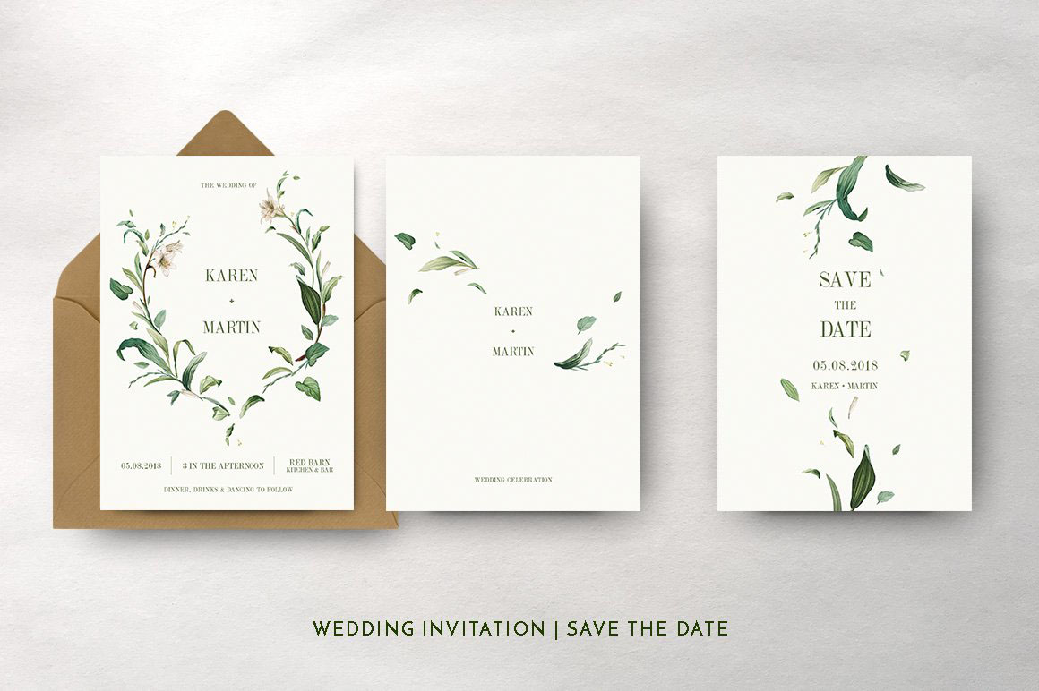 Simple and elegant white and green wedding invitation design with a mix of floral illustration & sophisticated fonts for your wedding celebration! What you have in the package is: wedding invite, save the date, RSVP, table number, escort card, menu card and thank you card for your guest, where everything is very easy to edit: text & color. For the PSD files, the layers are well arranged & color highlighted, so you can customise it easily.