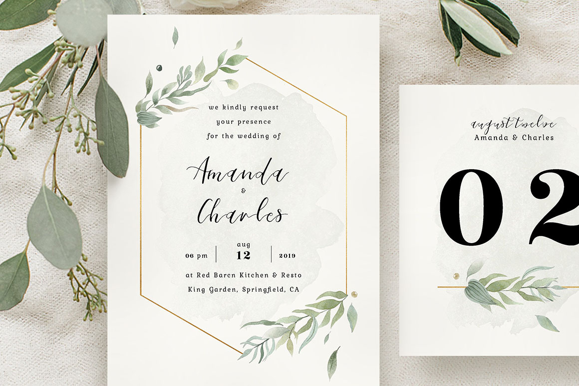 Rustic greenery illustration, modern calligraphy and gold touch invitation design for your wedding celebration. What you have in the package is: wedding invite, save the date, RSVP, table number, escort card, menu card, thank you card and big wedding poster (welcome sign) for your guest, where everything is very easy to edit: text & color. For the PSD files, the layers are well arranged & color highlighted, so you can customise it easily.