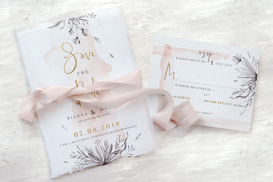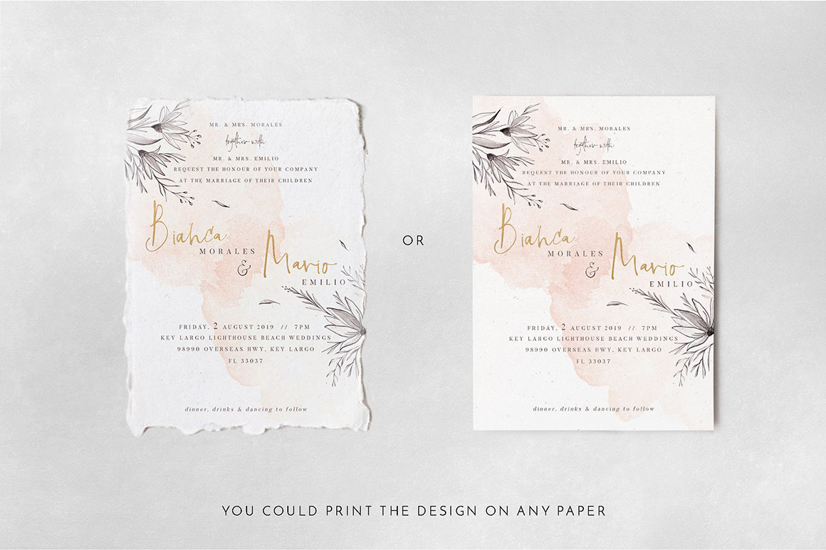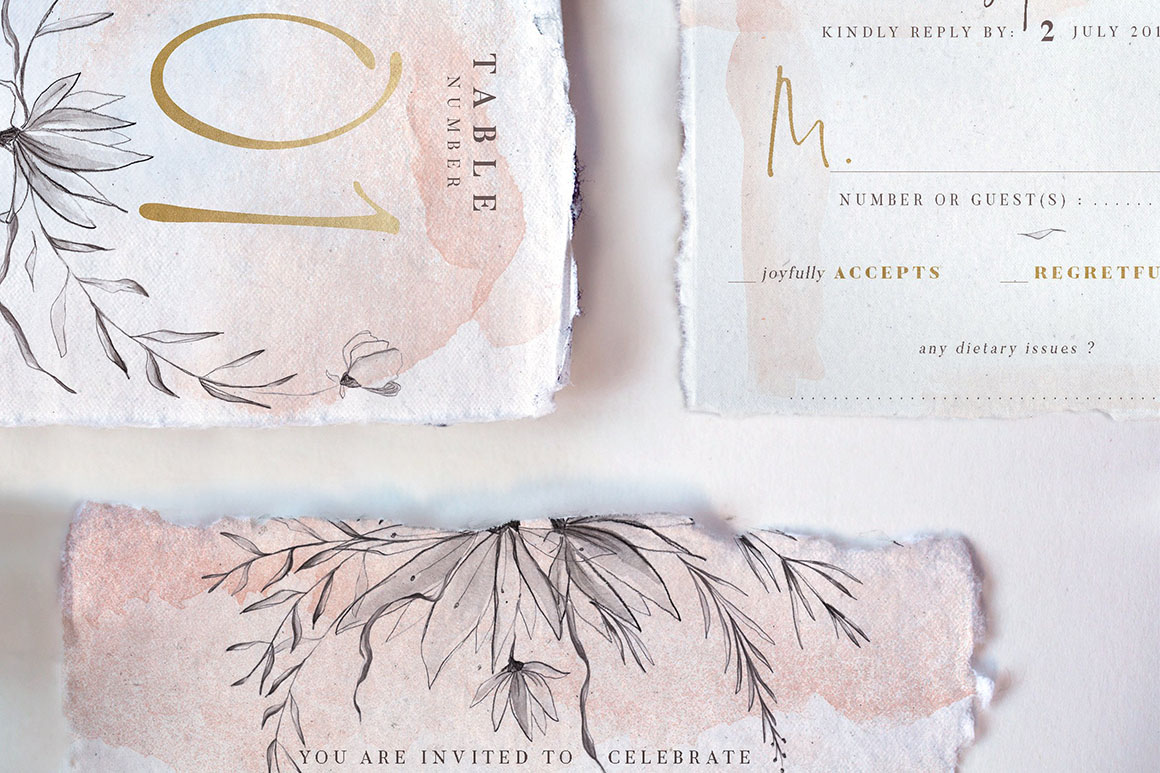 Artsy watercolor package for your wedding that contains a mix of hand drawn eucalyptus illustration, thin branch to make a geometric lines & modern calligraphy! What you have in the package is: wedding invite, save the date, RSVP, table number, escort card, menu card, and thank you card for your guest. For the PSD files, the layers are well arranged & color highlighted, so you can customise it easily. All details are very easy to edit.
