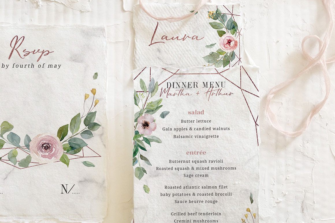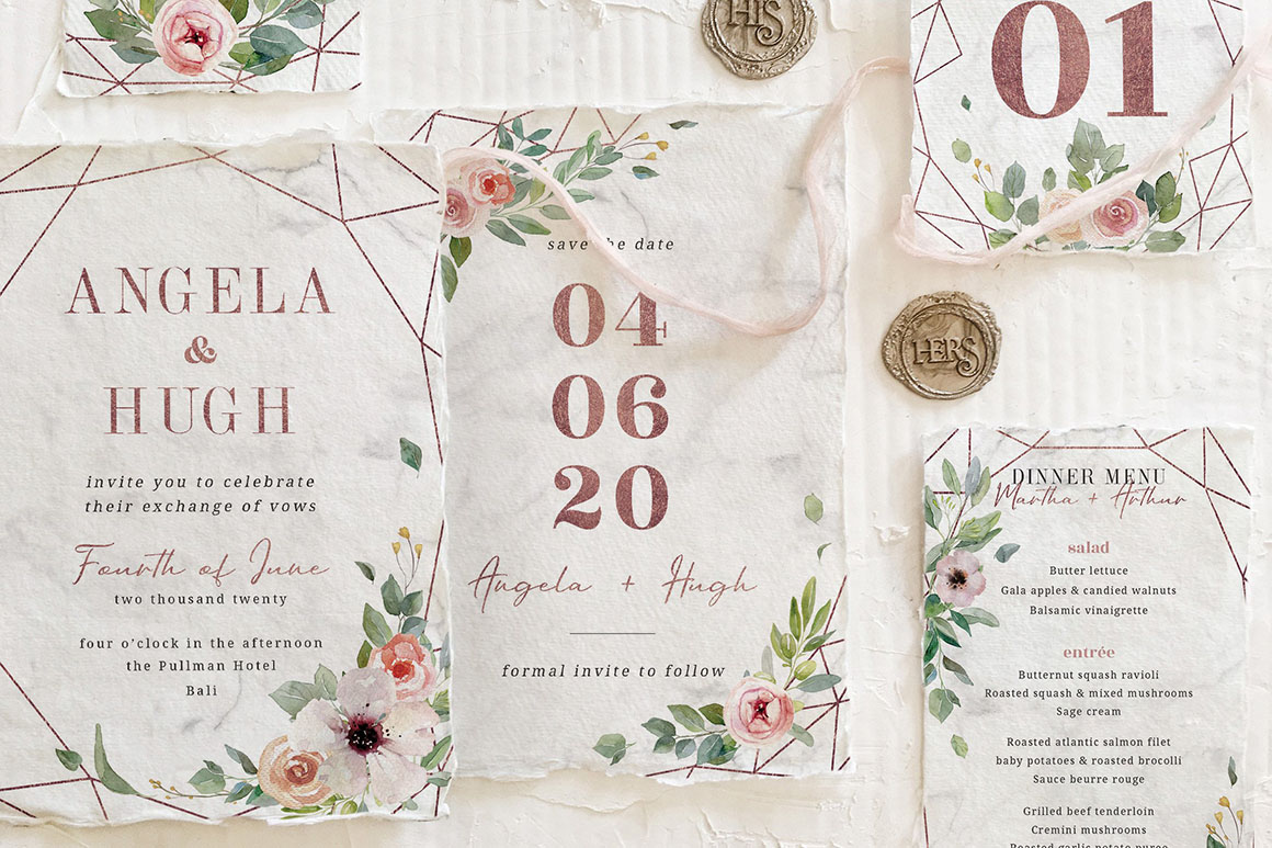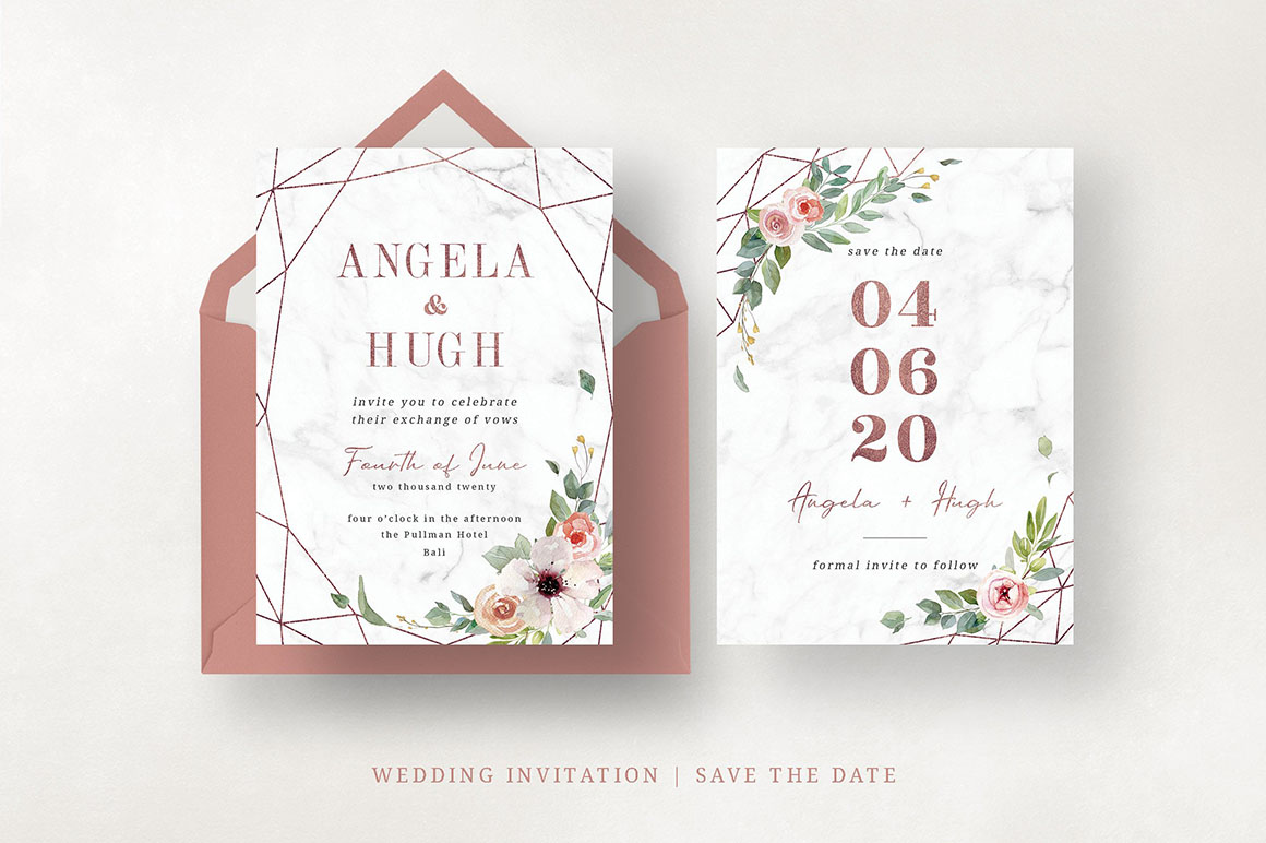 A modern & sophisticated style of marble texture, rose-gold geometric pattern & watercolor floral illustration for your wedding celebration. What you have in the package is: wedding invite, save the date, RSVP, table number, escort card, menu card, and thank you card for your guest, where everything is very easy to edit: text & color. For the PSD files, the layers are well arranged & color highlighted, so you can customise it easily.