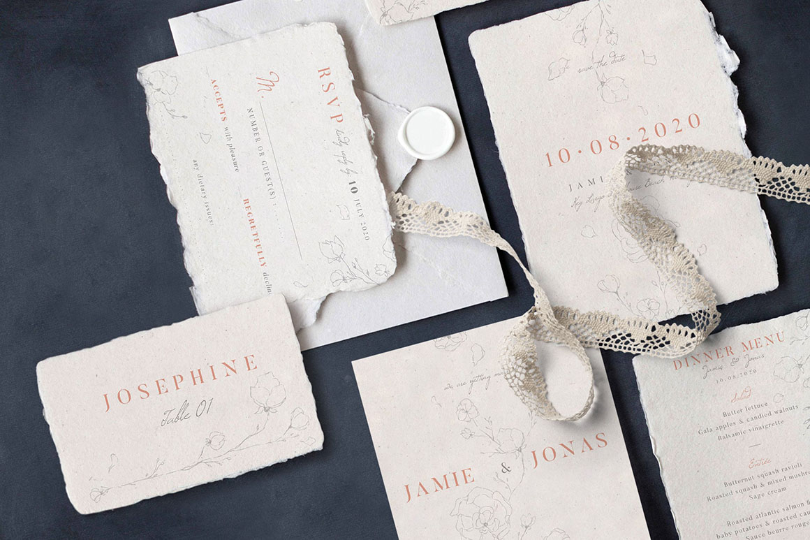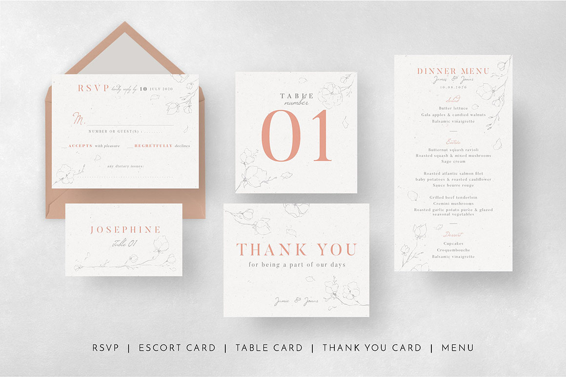 Classy yet stylish wedding invitation design in peach color with a mix of hand drawn illustration & modern layout for your wedding celebration! What you have in the package is: wedding invite, save the date, RSVP, table number, escort card, menu card, and thank you card for your guest, where everything is very easy to edit: text & color. For the PSD files, the layers are well arranged & color highlighted, so you can customise it easily.