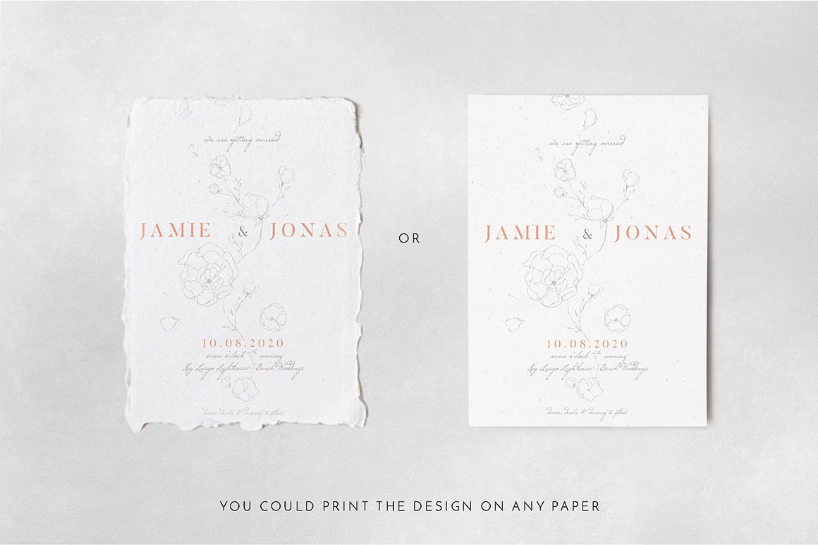 Romantic & minimalist design for your wedding, with a mix of hand drawn floral art-line illustration & modern calligraphy! What you have in the package is: wedding invite (2 options), save the date (2 options), RSVP, table number (2 options), escort card (2 options), menu card, and thank you card for your guest. All these are available in 4 color options. For the PSD files, the layers are well arranged & color highlighted, so you can customise it easily. All details are very easy to edit.