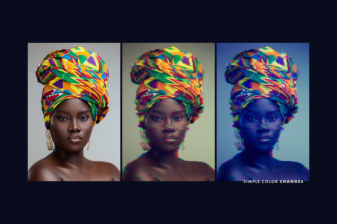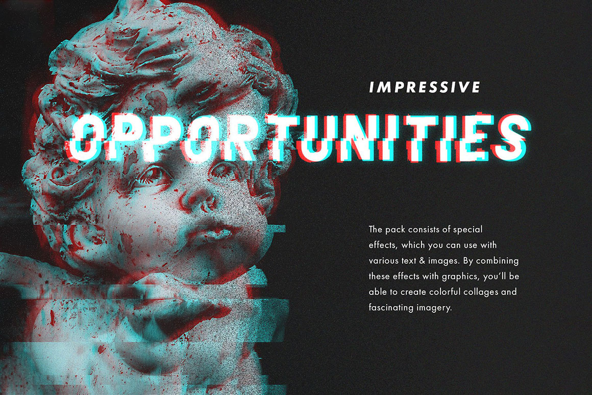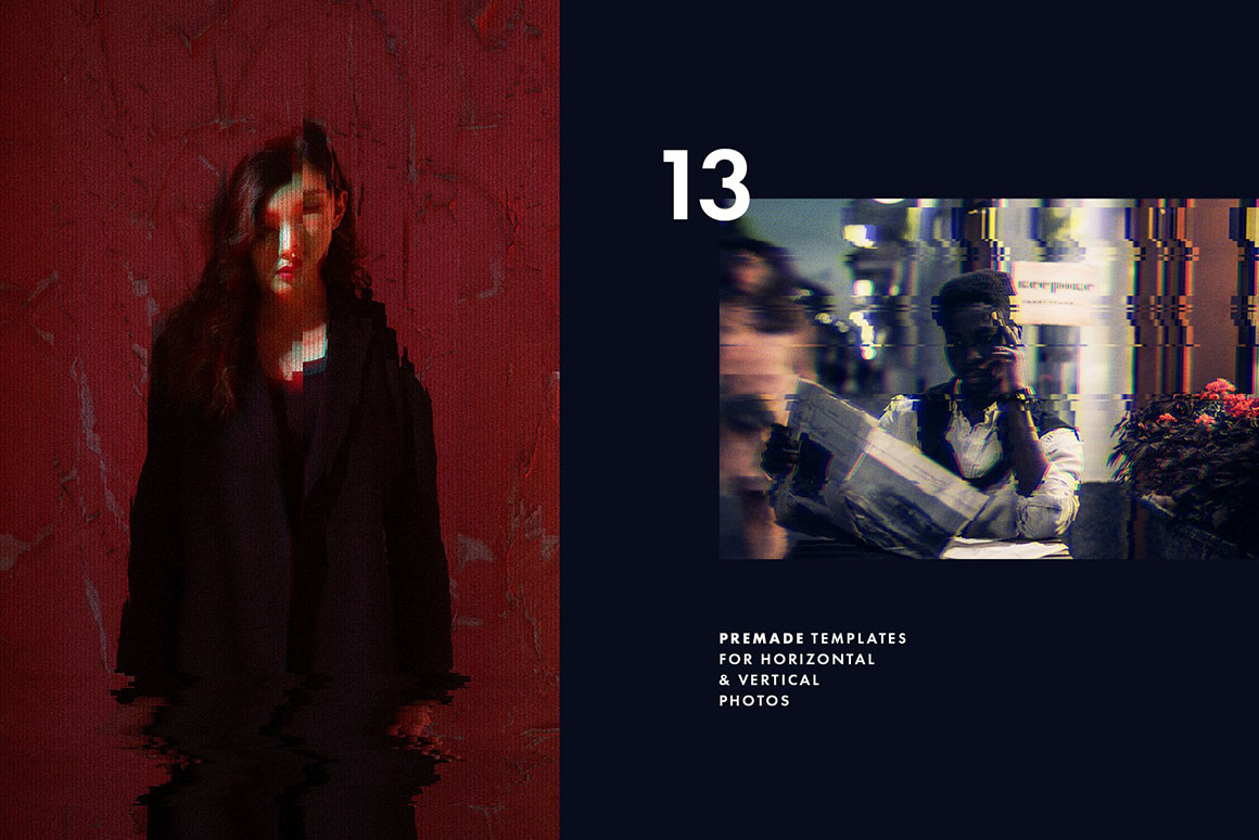 Observe the beauty of 13 photo effects and 6 text effects in this cool bundle from Pixelbuddha, switching to glitch anything you put to good use. Any graphics obtains the artistic “crashed” look in seconds, exuding the 8-bit arcade machine vibes from these retro gaming places they still keep somewhere. But you know what will literally make your artwork glitch? The 3 animated distortion effects, magically turning the static image into live motion one. The effects are pretty simple to work with, but the little instruction and video tutorial are also included. Go on produce the glitch effect for your ads, banners, invitations, covers, and all the other artforms you can come up with.