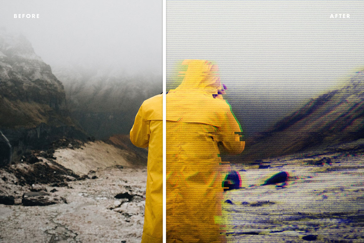 Somewhere between the distorted static scan lines, the aesthetics of vintage VHS videos is hidden. What is meant to be a malfunction in the first place is now a trendy design tool, which can be used to create attention-getting work. A crowd of little color mismatches, noise, and distortion will immerse in your images from the juicy pack of Glitch Effects we’ve carefully collected from tons of broken pixels.